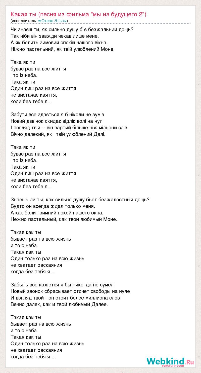 Чи знаєш ти, як сильно душу б`є безжальний дощь? Так ніби він завжди чекав лише мене. А як болить зимовий спокій нашого вікна, Ніжно пастельний, як твій улюблений Моне. Така як ти буває раз на все життя і то із неба. Така як ти Один лиш раз на все життя не вистачає каяття, коли без тебе я... Забути все здається я б ніколи не зумів Новий дзвінок скидає відлік волі на нулі І погляд твій -- він вартий більше ніж мільони слів Вічно далекий, як і твій улюблений Далі. Така як ти буває раз на все життя і то із неба. Така як ти Один лиш раз на все життя не вистачає каяття, коли без тебе я... Знаешь ли ты, как сильно душу бьет безжалостный дощь? Будто он всегда ждал только меня. А как болит зимний покой нашего окна, Нежно пастельный, как твой любимый Моне. Такая как ты бывает раз на всю жизнь и то с неба. Такая как ты Один только раз на всю жизнь не хватает раскаяния когда без тебя я ... Забыть все кажется я бы никогда не сумел Новый звонок сбрасывает отсчет свободы на нуле И взгляд твой - он стоит более миллиона слов Вечно далек, как и твой любимый Далее. Такая как ты бывает раз на всю жизнь и то с неба. Такая как ты Один только раз на всю жизнь не хватает раскаяния когда без тебя я ...