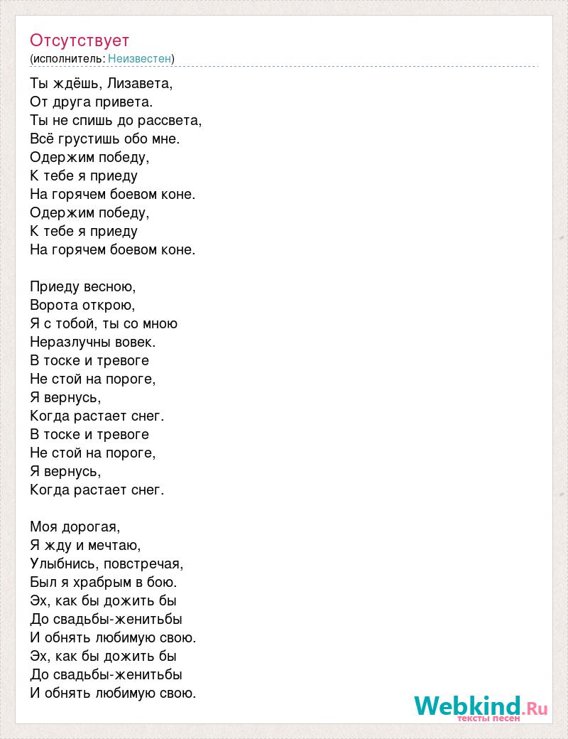 Ты ждёшь, Лизавета, От друга привета. Ты не спишь до рассвета, Всё грустишь обо мне. Одержим победу, К тебе я приеду На горячем боевом коне. Одержим победу, К тебе я приеду На горячем боевом коне. Приеду весною, Ворота открою, Я с тобой, ты со мною Неразлучны вовек. В тоске и тревоге Не стой на пороге, Я вернусь, Когда растает снег. В тоске и тревоге Не стой на пороге, Я вернусь, Когда растает снег. Моя дорогая, Я жду и мечтаю, Улыбнись, повстречая, Был я храбрым в бою. Эх, как бы дожить бы До свадьбы-женитьбы И обнять любимую свою. Эх, как бы дожить бы До свадьбы-женитьбы И обнять любимую свою.