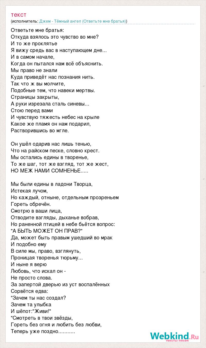 Ответьте мне братья: Откуда взялось это чувство во мне? И то же проклятье Я вижу средь вас в наступающем дне... И в самом начале, Когда он пытался нам всё объяснить. Мы право не знали Куда приведёт нас познания нить. Так что ж вы молчите, Подобные тем, что навеки мертвы. Страницы закрыты, А руки изрезала сталь синевы... Стою перед вами И чувствую тяжесть небес на крыле Какое же пламя он нам подарил, Растворившись во мгле. Он ушёл одарив нас лишь тенью, Что на райском песке, словно крест. Мы остались едины в творенье, То же шаг, тот же взгляд, тот же жест, НО МЕЖ НАМИ СОМНЕНЬЕ..... Мы были едины в ладони Творца, Истекая лучом, Но каждый, отныне, отдельным прозреньем Гореть обречён. Смотрю в ваши лица, Отводите взгляды, дыханье вобрав, Но раненной птицей в небе бьётся вопрос: "А БЫТЬ МОЖЕТ ОН ПРАВ?" Да, может быть правым ушедший во мрак И подобно ему В силе мы, право, взглянуть, Проницая творенья тюрьму... И ныне я верю Любовь, что искал он - Не просто слова. За запертой дверью из уст воспалённых Сорвётся едва: "Зачем ты нас создал? Зачем та улыбка И шёпот:"Живи!" "Смотреть в твои звёзды, Гореть без огня и любить без любви, Теперь уже поздно...........