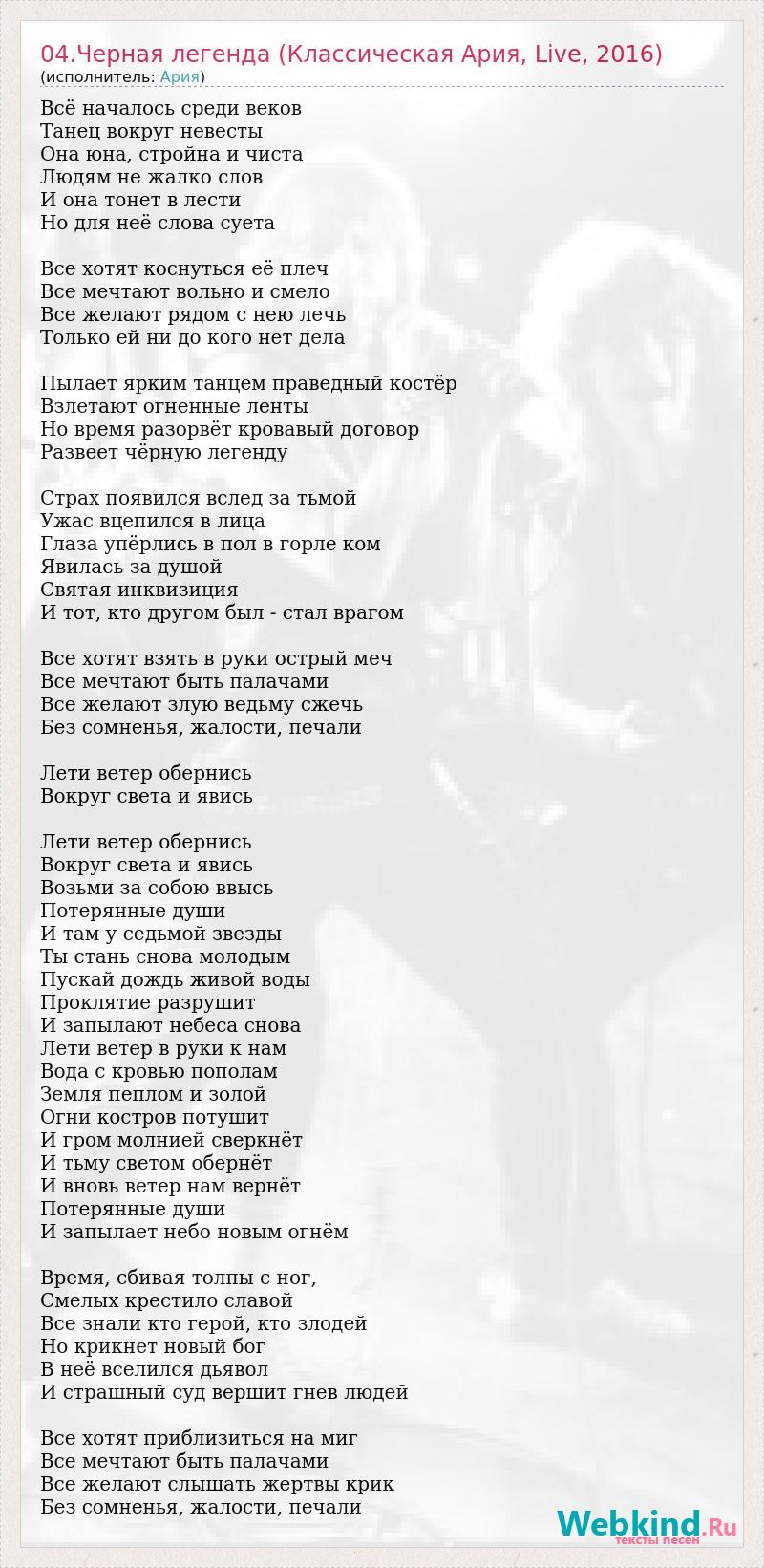 А как ты думаешь, о чем песня "04.Черная легенда (Классическая Ария, Live, 2016)" ?