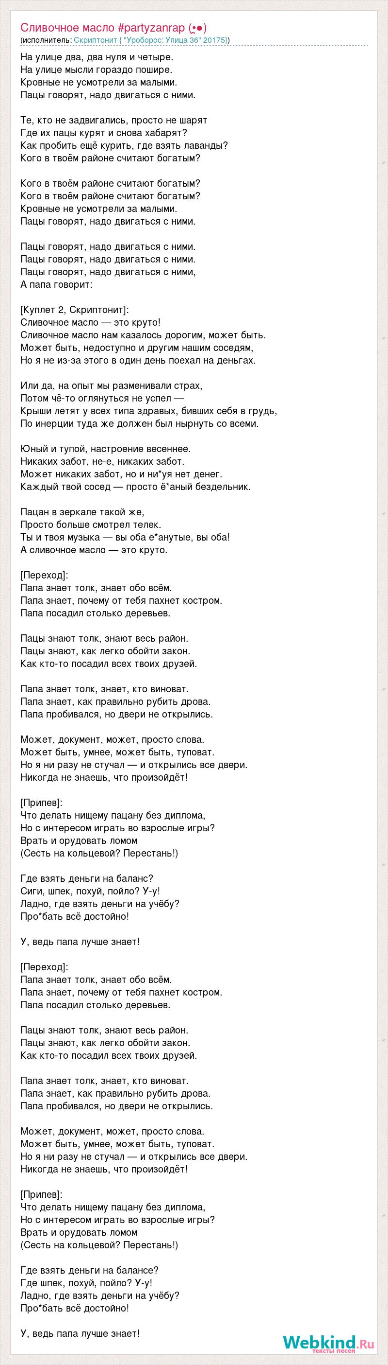 На улице два, два нуля и четыре. На улице мысли гораздо пошире. Кровные не усмотрели за малыми. Пацы говорят, надо двигаться с ними. Те, кто не задвигались, просто не шарят Где их пацы курят и снова хабарят? Как пробить ещё курить, где взять лаванды? Кого в твоём районе считают богатым? Кого в твоём районе считают богатым? Кого в твоём районе считают богатым? Кровные не усмотрели за малыми. Пацы говорят, надо двигаться с ними. Пацы говорят, надо двигаться с ними. Пацы говорят, надо двигаться с ними. Пацы говорят, надо двигаться с ними, А папа говорит: [Куплет 2, Скриптонит]: Сливочное масло — это круто! Сливочное масло нам казалось дорогим, может быть. Может быть, недоступно и другим нашим соседям, Но я не из-за этого в один день поехал на деньгах. Или да, на опыт мы разменивали страх, Потом чё-то оглянуться не успел — Крыши летят у всех типа здравых, бивших себя в грудь, По инерции туда же должен был нырнуть со всеми. Юный и тупой, настроение весеннее. Никаких забот, не-е, никаких забот. Может никаких забот, но и ни*уя нет денег. Каждый твой сосед — просто ё*аный бездельник. Пацан в зеркале такой же, Просто больше смотрел телек. Ты и твоя музыка — вы оба е*анутые, вы оба! А сливочное масло — это круто. [Переход]: Папа знает толк, знает обо всём. Папа знает, почему от тебя пахнет костром. Папа посадил столько деревьев. Пацы знают толк, знают весь район. Пацы знают, как легко обойти закон. Как кто-то посадил всех твоих друзей. Папа знает толк, знает, кто виноват. Папа знает, как правильно рубить дрова. Папа пробивался, но двери не открылись. Может, документ, может, просто слова. Может быть, умнее, может быть, туповат. Но я ни разу не стучал — и открылись все двери. Никогда не знаешь, что произойдёт! [Припев]: Что делать нищему пацану без диплома, Но с интересом играть во взрослые игры? Врать и орудовать ломом (Сесть на кольцевой? Перестань!) Где взять деньги на баланс? Сиги, шпек, похуй, пойло? У-у! Ладно, где взять деньги на учёбу? Про*бать всё достойно! У, ведь папа лучше знает! [Переход]: Папа знает толк, знает обо всём. Папа знает, почему от тебя пахнет костром. Папа посадил столько деревьев. Пацы знают толк, знают весь район. Пацы знают, как легко обойти закон. Как кто-то посадил всех твоих друзей. Папа знает толк, знает, кто виноват. Папа знает, как правильно рубить дрова. Папа пробивался, но двери не открылись. Может, документ, может, просто слова. Может быть, умнее, может быть, туповат. Но я ни разу не стучал — и открылись все двери. Никогда не знаешь, что произойдёт! [Припев]: Что делать нищему пацану без диплома, Но с интересом играть во взрослые игры? Врать и орудовать ломом (Сесть на кольцевой? Перестань!) Где взять деньги на балансе? Где шпек, похуй, пойло? У-у! Ладно, где взять деньги на учёбу? Про*бать всё достойно! У, ведь папа лучше знает!