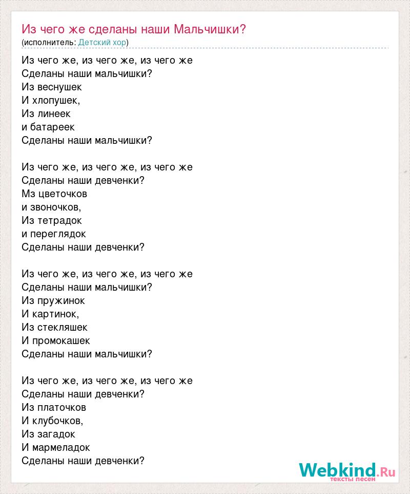 Из чего же, из чего же, из чего же Сделаны наши мальчишки? Из веснушек И хлопушек, Из линеек и батареек Сделаны наши мальчишки? Из чего же, из чего же, из чего же Сделаны наши девченки? Мз цветочков и звоночков, Из тетрадок и переглядок Сделаны наши девченки? Из чего же, из чего же, из чего же Сделаны наши мальчишки? Из пружинок И картинок, Из стекляшек И промокашек Сделаны наши мальчишки? Из чего же, из чего же, из чего же Сделаны наши девченки? Из платочков И клубочков, Из загадок И мармеладок Сделаны наши девченки?
