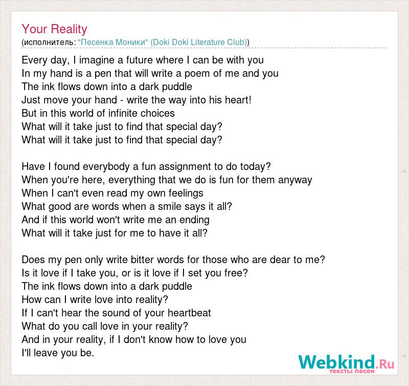 Every day, I imagine a future where I can be with you In my hand is a pen that will write a poem of me and you The ink flows down into a dark puddle Just move your hand - write the way into his heart! But in this world of infinite choices What will it take just to find that special day? What will it take just to find that special day? Have I found everybody a fun assignment to do today? When you're here, everything that we do is fun for them anyway When I can't even read my own feelings What good are words when a smile says it all? And if this world won't write me an ending What will it take just for me to have it all? Does my pen only write bitter words for those who are dear to me? Is it love if I take you, or is it love if I set you free? The ink flows down into a dark puddle How can I write love into reality? If I can't hear the sound of your heartbeat What do you call love in your reality? And in your reality, if I don't know how to love you I'll leave you be.