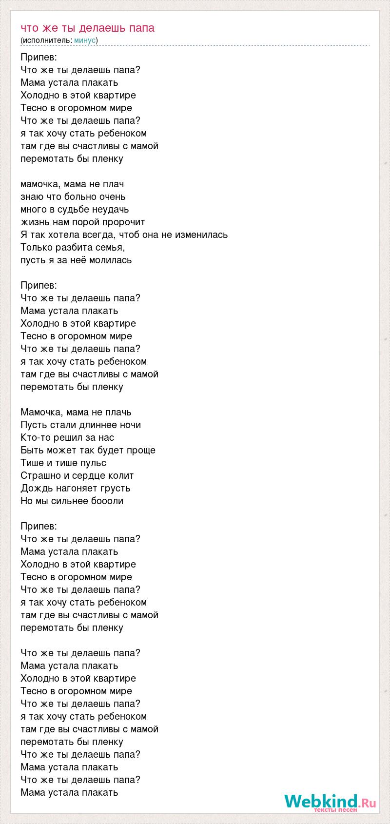 Припев: Что же ты делаешь папа? Мама устала плакать Холодно в этой квартире Тесно в огоромном мире Что же ты делаешь папа? я так хочу стать ребеноком там где вы счастливы с мамой перемотать бы пленку мамочка, мама не плач знаю что больно очень много в судьбе неудачь жизнь нам порой пророчит Я так хотела всегда, чтоб она не изменилась Только разбита семья, пусть я за неё молилась Припев: Что же ты делаешь папа? Мама устала плакать Холодно в этой квартире Тесно в огоромном мире Что же ты делаешь папа? я так хочу стать ребеноком там где вы счастливы с мамой перемотать бы пленку Мамочка, мама не плачь Пусть стали длиннее ночи Кто-то решил за нас Быть может так будет проще Тише и тише пульс Страшно и сердце колит Дождь нагоняет грусть Но мы сильнее боооли Припев: Что же ты делаешь папа? Мама устала плакать Холодно в этой квартире Тесно в огоромном мире Что же ты делаешь папа? я так хочу стать ребеноком там где вы счастливы с мамой перемотать бы пленку Что же ты делаешь папа? Мама устала плакать Холодно в этой квартире Тесно в огоромном мире Что же ты делаешь папа? я так хочу стать ребеноком там где вы счастливы с мамой перемотать бы пленку Что же ты делаешь папа? Мама устала плакать Что же ты делаешь папа? Мама устала плакать