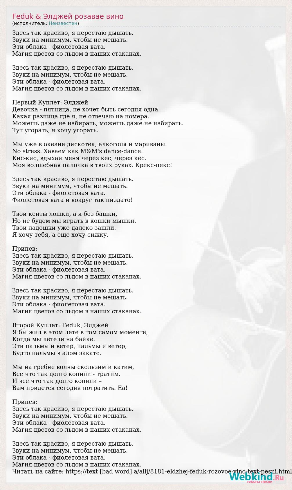 Здесь так красиво, я перестаю дышать. Звуки на минимум, чтобы не мешать. Эти облака - фиолетовая вата. Магия цветов со льдом в наших стаканах. Здесь так красиво, я перестаю дышать. Звуки на минимум, чтобы не мешать. Эти облака - фиолетовая вата. Магия цветов со льдом в наших стаканах. Первый Куплет: Элджей Девочка - пятница, не хочет быть сегодня одна. Какая разница где я, не отвечаю на номера. Можешь даже не набирать, можешь даже не набирать. Тут угорать, я хочу угорать. Мы уже в океане дискотек, алкоголя и мариваны. No stress. Хаваем как M&M's dance-dance. Кис-кис, вдыхай меня через кес, через кес. Моя волшебная палочка в твоих руках. Крекс-пекс! Здесь так красиво, я перестаю дышать. Звуки на минимум, чтобы не мешать. Эти облака - фиолетовая вата. Фиолетовая вата и вокруг так пиздато! Твои кенты лошки, а я без башки, Но не будем мы играть в кошки-мышки. Твои ладошки уже далеко зашли. Я хочу тебя, а еще хочу сижку. Припев: Здесь так красиво, я перестаю дышать. Звуки на минимум, чтобы не мешать. Эти облака - фиолетовая вата. Магия цветов со льдом в наших стаканах. Здесь так красиво, я перестаю дышать. Звуки на минимум, чтобы не мешать. Эти облака - фиолетовая вата. Магия цветов со льдом в наших стаканах. Второй Куплет: Feduk, Элджей Я бы жил в этом лете в том самом моменте, Когда мы летели на байке. Эти пальмы и ветер, пальмы и ветер, Будто пальмы в алом закате. Мы на гребне волны скользим и катим, Все что так долго копили - тратим. И все что так долго копили – Вам придется сегодня потратить. Еа! Припев: Здесь так красиво, я перестаю дышать. Звуки на минимум, чтобы не мешать. Эти облака - фиолетовая вата. Магия цветов со льдом в наших стаканах. Здесь так красиво, я перестаю дышать. Звуки на минимум, чтобы не мешать. Эти облака - фиолетовая вата. Магия цветов со льдом в наших стаканах. Читать на сайте: https://text [bad word] a/allj/8181-eldzhej-feduk-rozovoe-vino-text-pesni.html