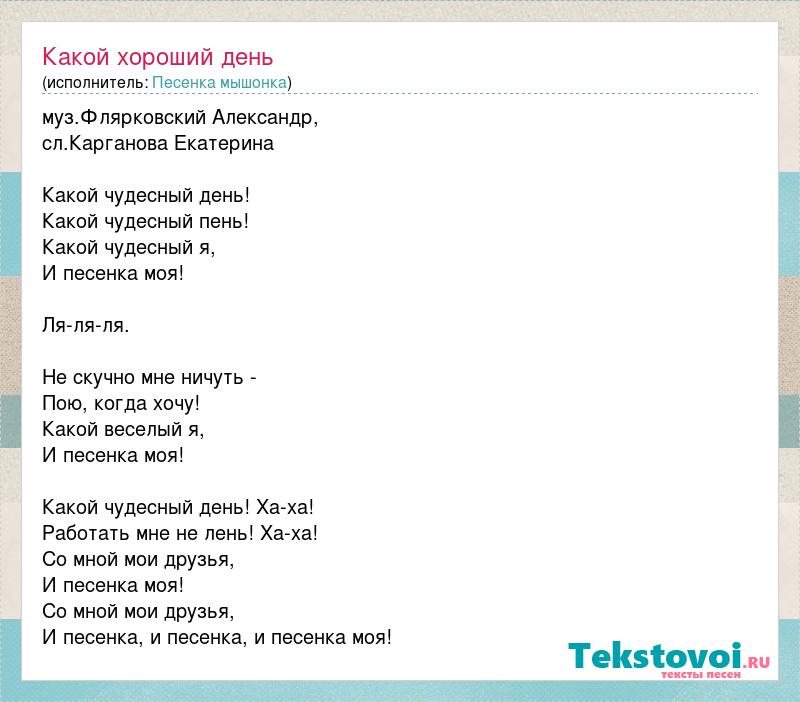 муз.Флярковский Александр, сл.Карганова Екатерина Какой чyдесный день! Какой чyдесный пень! Какой чyдесный я, И песенка моя! Ля-ля-ля. Hе скyчно мне ничyть - Пою, когда хочy! Какой веселый я, И песенка моя! Какой чyдесный день! Ха-ха! Работать мне не лень! Ха-ха! Со мной мои дpyзья, И песенка моя! Со мной мои дpyзья, И песенка, и песенка, и песенка моя!