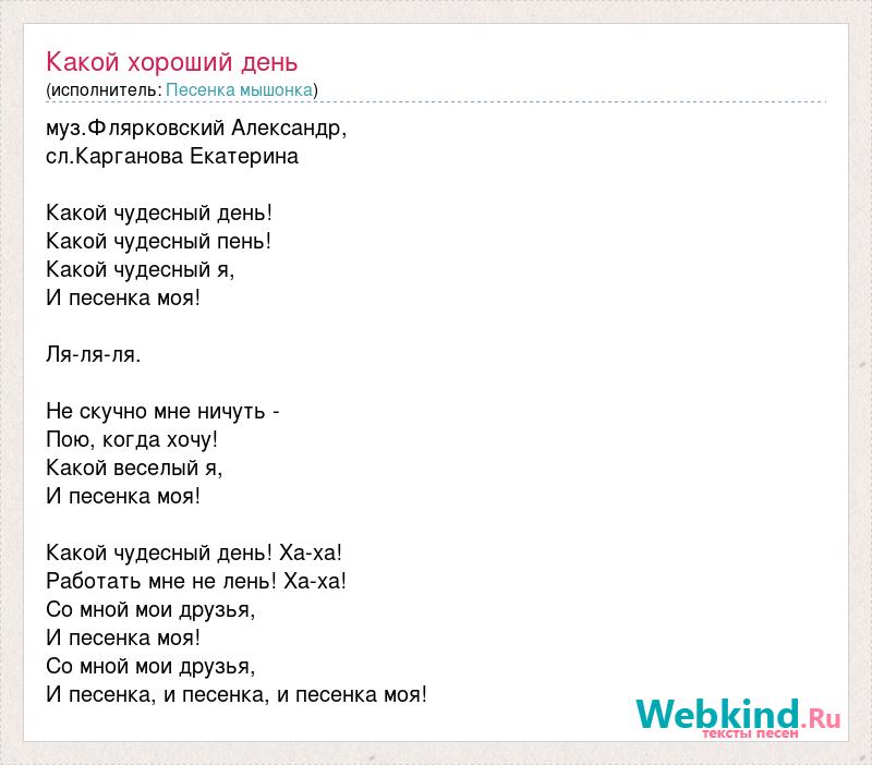 муз.Флярковский Александр, сл.Карганова Екатерина Какой чyдесный день! Какой чyдесный пень! Какой чyдесный я, И песенка моя! Ля-ля-ля. Hе скyчно мне ничyть - Пою, когда хочy! Какой веселый я, И песенка моя! Какой чyдесный день! Ха-ха! Работать мне не лень! Ха-ха! Со мной мои дpyзья, И песенка моя! Со мной мои дpyзья, И песенка, и песенка, и песенка моя!
