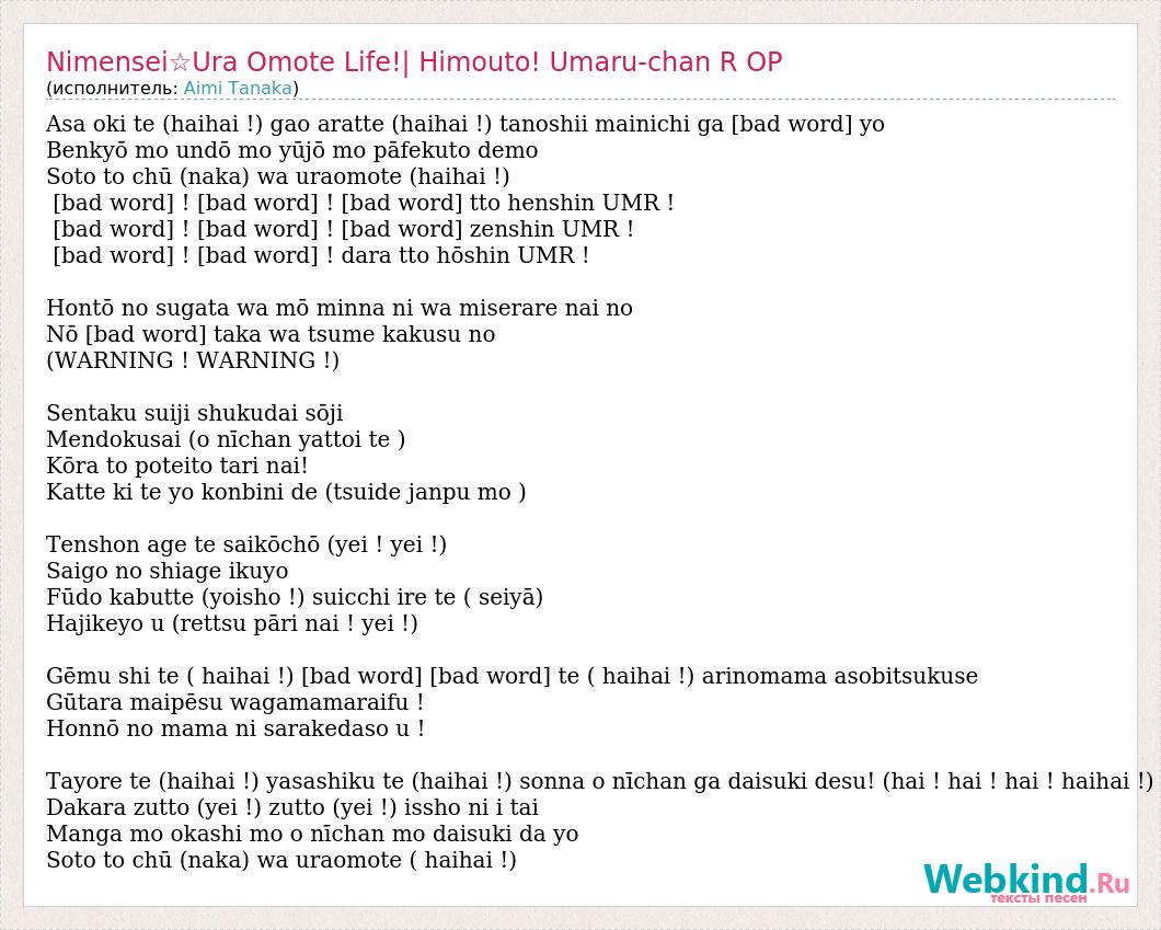 Asa oki te (haihai !) gao aratte (haihai !) tanoshii mainichi ga [bad word] yo Benkyō mo undō mo yūjō mo pāfekuto demo Soto to chū (naka) wa uraomote (haihai !) [bad word] ! [bad word] ! [bad word] tto henshin UMR ! [bad word] ! [bad word] ! [bad word] zenshin UMR ! [bad word] ! [bad word] ! dara tto hōshin UMR ! Hontō no sugata wa mō minna ni wa miserare nai no Nō [bad word] taka wa tsume kakusu no (WARNING ! WARNING !) Sentaku suiji shukudai sōji Mendokusai (o nīchan yattoi te ~) Kōra to poteito tari nai! Katte ki te yo konbini de (tsuide janpu mo 〜) Tenshon age te saikōchō (yei ! yei !) Saigo no shiage ikuyo Fūdo kabutte (yoisho !) suicchi ire te ( seiyā) Hajikeyo u (rettsu pāri nai ! yei !) Gēmu shi te ( haihai !) [bad word] [bad word] te ( haihai !) arinomama asobitsukuse Gūtara maipēsu wagamamaraifu ! Honnō no mama ni sarakedaso u ! Tayore te (haihai !) yasashiku te (haihai !) sonna o nīchan ga daisuki desu! (hai ! hai ! hai ! haihai !) Dakara zutto (yei !) zutto (yei !) issho ni i tai Manga mo okashi mo o nīchan mo daisuki da yo Soto to chū (naka) wa uraomote ( haihai !)
