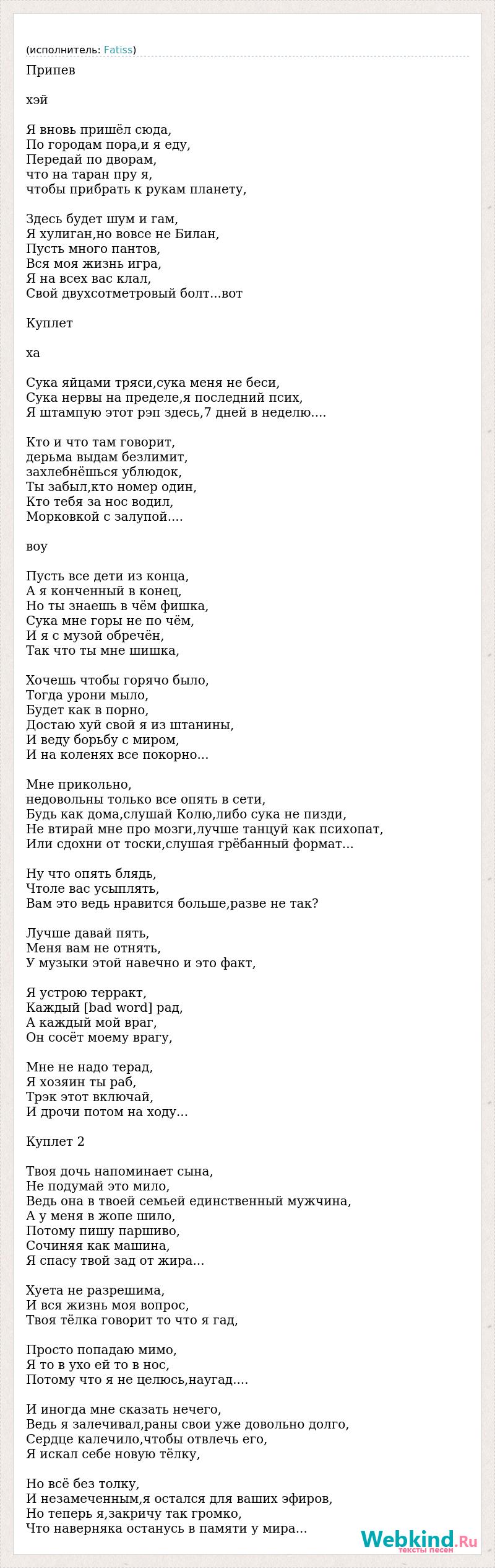 Припев хэй Я вновь пришёл сюда, По городам пора,и я еду, Передай по дворам, что на таран пру я, чтобы прибрать к рукам планету, Здесь будет шум и гам, Я хулиган,но вовсе не Билан, Пусть много пантов, Вся моя жизнь игра, Я на всех вас клал, Свой двухсотметровый болт...вот Куплет ха Сука яйцами тряси,сука меня не беси, Сука нервы на пределе,я последний псих, Я штампую этот рэп здесь,7 дней в неделю.... Кто и что там говорит, дерьма выдам безлимит, захлебнёшься ублюдок, Ты забыл,кто номер один, Кто тебя за нос водил, Морковкой с залупой.... воу Пусть все дети из конца, А я конченный в конец, Но ты знаешь в чём фишка, Сука мне горы не по чём, И я с музой обречён, Так что ты мне шишка, Хочешь чтобы горячо было, Тогда урони мыло, Будет как в порно, Достаю хуй свой я из штанины, И веду борьбу с миром, И на коленях все покорно... Мне прикольно, недовольны только все опять в сети, Будь как дома,слушай Колю,либо сука не пизди, Не втирай мне про мозги,лучше танцуй как психопат, Или сдохни от тоски,слушая грёбанный формат... Ну что опять блядь, Чтоле вас усыплять, Вам это ведь нравится больше,разве не так? Лучше давай пять, Меня вам не отнять, У музыки этой навечно и это факт, Я устрою терракт, Каждый [bad word] рад, А каждый мой враг, Он сосёт моему врагу, Мне не надо терад, Я хозяин ты раб, Трэк этот включай, И дрочи потом на ходу... Куплет 2 Твоя дочь напоминает сына, Не подумай это мило, Ведь она в твоей семьей единственный мужчина, А у меня в жопе шило, Потому пишу паршиво, Сочиняя как машина, Я спасу твой зад от жира... Хуета не разрешима, И вся жизнь моя вопрос, Твоя тёлка говорит то что я гад, Просто попадаю мимо, Я то в ухо ей то в нос, Потому что я не целюсь,наугад.... И иногда мне сказать нечего, Ведь я залечивал,раны свои уже довольно долго, Сердце калечило,чтобы отвлечь его, Я искал себе новую тёлку, Но всё без толку, И незамеченным,я остался для ваших эфиров, Но теперь я,закричу так громко, Что наверняка останусь в памяти у мира...
