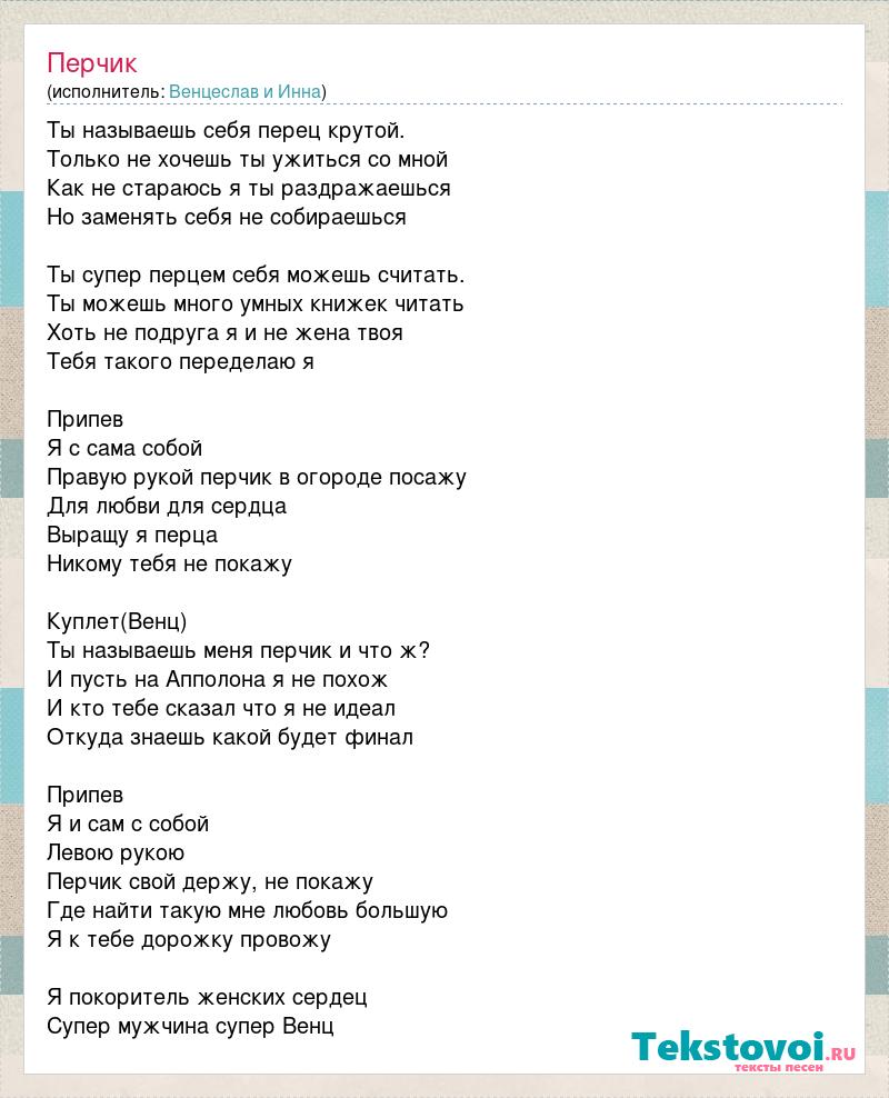 Ты называешь себя перец крутой. Только не хочешь ты ужиться со мной Как не стараюсь я ты раздражаешься Но заменять себя не собираешься Ты супер перцем себя можешь считать. Ты можешь много умных книжек читать Хоть не подруга я и не жена твоя Тебя такого переделаю я Припев Я с сама собой Правую рукой перчик в огороде посажу Для любви для сердца Выращу я перца Никому тебя не покажу Куплет(Венц) Ты называешь меня перчик и что ж? И пусть на Апполона я не похож И кто тебе сказал что я не идеал Откуда знаешь какой будет финал Припев Я и сам с собой Левою рукою Перчик свой держу, не покажу Где найти такую мне любовь большую Я к тебе дорожку провожу Я покоритель женских сердец Супер мужчина супер Венц