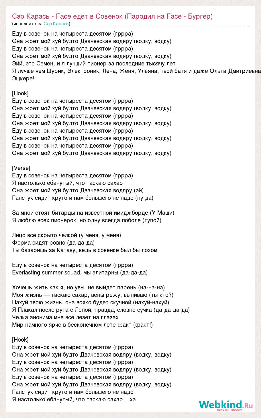 Еду в совенок на четыреста десятом (гррра) Она жрет мой хуй будто Двачевская водяру (водку, водку) Еду в совенок на четыреста десятом (гррра) Она жрет мой хуй будто Двачевская водяру (водку, водку) Эйй, это Семен, и я лучший пионер за последние тысячу лет Я лучше чем Шурик, Электроник, Лена, Женя, Ульяна, твой батя и даже Ольга Дмитриевна Эщкере! [Hook] Еду в совенок на четыреста десятом (гррра) Она жрет мой хуй будто Двачевская водяру (водку, водку) Еду в совенок на четыреста десятом (гррра) Она жрет мой хуй будто Двачевская водяру (водку, водку) Еду в совенок на четыреста десятом (гррра) Она жрет мой хуй будто Двачевская водяру (водку, водку) Еду в совенок на четыреста десятом (гррра) Она жрет мой хуй будто Двачевская водяру (водку, водку) [Verse] Еду в совенок на четыреста десятом (гррра) Я настолько ебанутый, что таскаю сахар Она жрет мой хуй будто Двачевская водяру (эй) Галстук сидит круто и нам большего не надо (ну да) За мной стоят битарды на известной имиджборде (У Маши) Я люблю всех пионерок, но одну всегда поболе (тупой) Лицо все скрыто челкой (у меня, у меня) Форма сидят ровно (да-да-да) Ты базаришь за Катаву, ведь в совенке был бы лохом Еду в совенок на четыреста десятом (гррра) Everlasting summer squad, мы элитарны (да-да-да) Хочешь жить как я, но увы не выйдет парень (на-на-на) Моя жизнь — таскаю сахар, вены режу, выпиваю (ты кто?) Нахуй твою жизнь, она всяко будет скучной (нахуй-нахуй) Я Плакал после рута с Леной, правда, словно сучка (да-да-да-да) Челка анонима мне все лезет на глазах Мир намного ярче в бесконечном лете факт (факт!) [Hook] Еду в совенок на четыреста десятом (гррра) Она жрет мой хуй будто Двачевская водяру (водку, водку) Еду в совенок на четыреста десятом (гррра) Она жрет мой хуй будто Двачевская водяру (водку, водку) Еду в совенок на четыреста десятом (гррра) Она жрет мой хуй будто Двачевская водяру (водку, водку) Галстук сидит круто и нам большего не надо Я настолько ебанутый, что таскаю сахар... ха