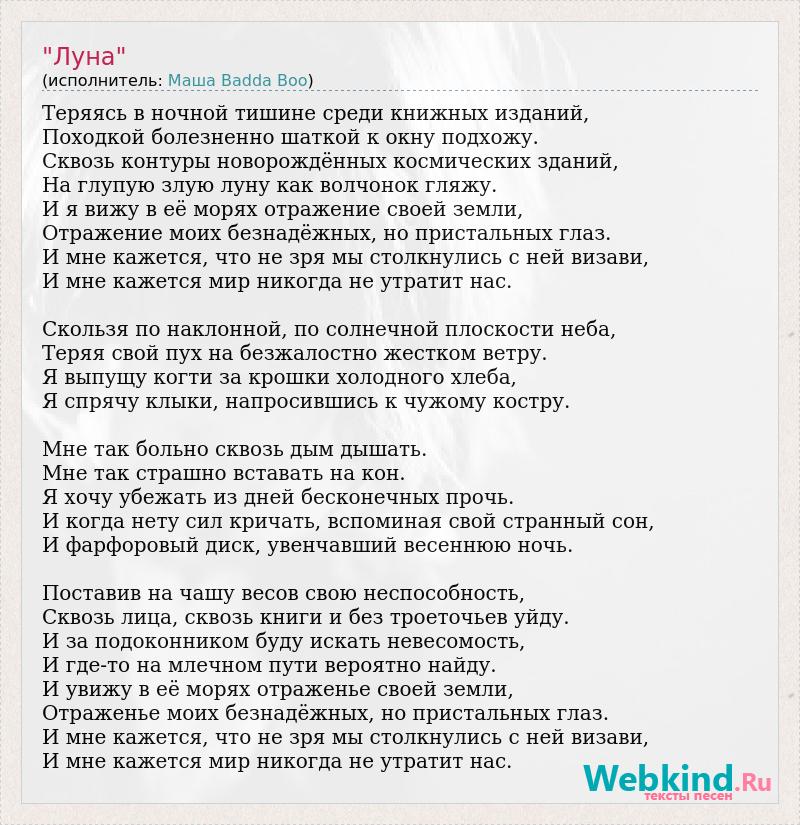 Теряясь в ночной тишине среди книжных изданий, Походкой болезненно шаткой к окну подхожу. Сквозь контуры новорождённых космических зданий, На глупую злую луну как волчонок гляжу. И я вижу в её морях отражение своей земли, Отражение моих безнадёжных, но пристальных глаз. И мне кажется, что не зря мы столкнулись с ней визави, И мне кажется мир никогда не утратит нас. Скользя по наклонной, по солнечной плоскости неба, Теряя свой пух на безжалостно жестком ветру. Я выпущу когти за крошки холодного хлеба, Я спрячу клыки, напросившись к чужому костру. Мне так больно сквозь дым дышать. Мне так страшно вставать на кон. Я хочу убежать из дней бесконечных прочь. И когда нету сил кричать, вспоминая свой странный сон, И фарфоровый диск, увенчавший весеннюю ночь. Поставив на чашу весов свою неспособность, Сквозь лица, сквозь книги и без троеточьев уйду. И за подоконником буду искать невесомость, И где-то на млечном пути вероятно найду. И увижу в её морях отраженье своей земли, Отраженье моих безнадёжных, но пристальных глаз. И мне кажется, что не зря мы столкнулись с ней визави, И мне кажется мир никогда не утратит нас.