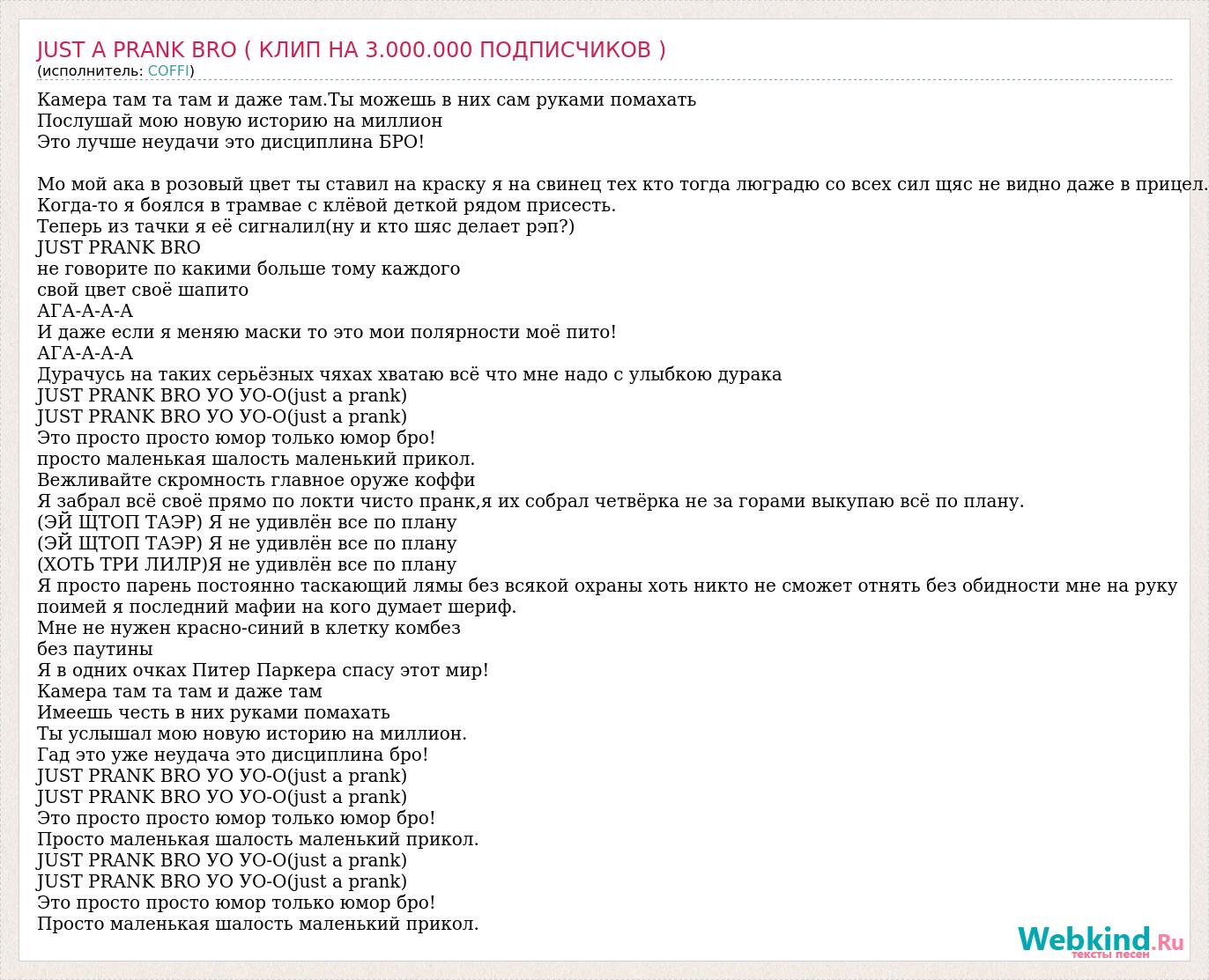 Камера там та там и даже там.Ты можешь в них сам руками помахать Послушай мою новую историю на миллион Это лучше неудачи это дисциплина БРО! Мо мой ака в розовый цвет ты ставил на краску я на свинец тех кто тогда люградю со всех сил щяс не видно даже в прицел. Когда-то я боялся в трамвае с клёвой деткой рядом присесть. Теперь из тачки я её сигналил(ну и кто шяс делает рэп?) JUST PRANK BRO не говорите по какими больше тому каждого свой цвет своё шапито АГА-А-А-А И даже если я меняю маски то это мои полярности моё пито! АГА-А-А-А Дурачусь на таких серьёзных чяхах хватаю всё что мне надо с улыбкою дурака JUST PRANK BRO УО УО-О(just a prank) JUST PRANK BRO УО УО-О(just a prank) Это просто просто юмор только юмор бро! просто маленькая шалость маленький прикол. Вежливайте скромность главное оруже коффи Я забрал всё своё прямо по локти чисто пранк,я их собрал четвёрка не за горами выкупаю всё по плану. (ЭЙ ЩТОП ТАЭР) Я не удивлён все по плану (ЭЙ ЩТОП ТАЭР) Я не удивлён все по плану (ХОТЬ ТРИ ЛИЛР)Я не удивлён все по плану Я просто парень постоянно таскающий лямы без всякой охраны хоть никто не сможет отнять без обидности мне на руку поимей я последний мафии на кого думает шериф. Мне не нужен красно-синий в клетку комбез без паутины Я в одних очках Питер Паркера спасу этот мир! Камера там та там и даже там Имеешь честь в них руками помахать Ты услышал мою новую историю на миллион. Гад это уже неудача это дисциплина бро! JUST PRANK BRO УО УО-О(just a prank) JUST PRANK BRO УО УО-О(just a prank) Это просто просто юмор только юмор бро! Просто маленькая шалость маленький прикол. JUST PRANK BRO УО УО-О(just a prank) JUST PRANK BRO УО УО-О(just a prank) Это просто просто юмор только юмор бро! Просто маленькая шалость маленький прикол.