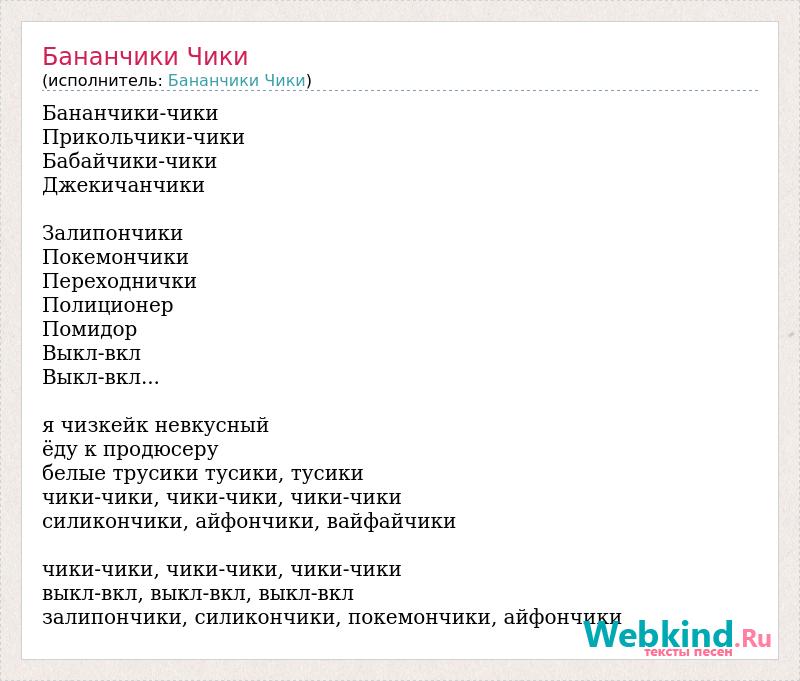 Бананчики-чики Прикольчики-чики Бабайчики-чики Джекичанчики Залипончики Покемончики Переходнички Полиционер Помидор Выкл-вкл Выкл-вкл... я чизкейк невкусный ёду к продюсеру белые трусики тусики, тусики чики-чики, чики-чики, чики-чики силикончики, айфончики, вайфайчики чики-чики, чики-чики, чики-чики выкл-вкл, выкл-вкл, выкл-вкл залипончики, силикончики, покемончики, айфончики