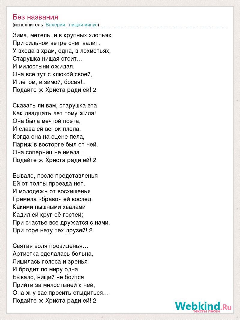 Зима, метель, и в крупных хлопьях При сильном ветре снег валит. У входа в храм, одна, в лохмотьях, Старушка нищая стоит… И милостыни ожидая, Она все тут с клюкой своей, И летом, и зимой, босая!.. Подайте ж Христа ради ей! 2 Сказать ли вам, старушка эта Как двадцать лет тому жила! Она была мечтой поэта, И слава ей венок плела. Когда она на сцене пела, Париж в восторге был от ней. Она соперниц не имела… Подайте ж Христа ради ей! 2 Бывало, после представленья Ей от толпы проезда нет. И молодежь от восхищенья Гремела «браво» ей вослед. Какими пышными хвалами Кадил ей круг её гостей; При счастье все дружатся с нами. При горе нету тех друзей! 2 Святая воля провиденья… Артистка сделалась больна, Лишилась голоса и зренья И бродит по миру одна. Бывало, нищий не боится Прийти за милостыней к ней, Она ж у вас просить стыдиться… Подайте ж Христа ради ей! 2