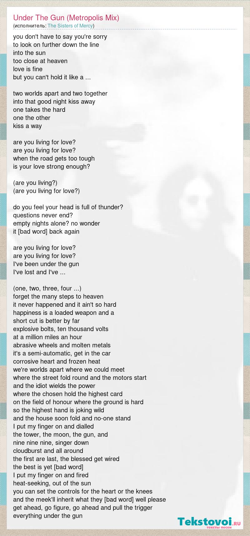 you don't have to say you're sorry to look on further down the line into the sun too close at heaven love is fine but you can't hold it like a ... two worlds apart and two together into that good night kiss away one takes the hard one the other kiss a way are you living for love? are you living for love? when the road gets too tough is your love strong enough? (are you living?) (are you living for love?) do you feel your head is full of thunder? questions never end? empty nights alone? no wonder it all comes back again are you living for love? are you living for love? I've been under the gun I've lost and I've ... (one, two, three, four ...) forget the many steps to heaven it never happened and it ain't so hard happiness is a loaded weapon and a short cut is better by far explosive bolts, ten thousand volts at a million miles an hour abrasive wheels and molten metals it's a semi-automatic, get in the car corrosive heart and frozen heat we're worlds apart where we could meet where the street fold round and the motors start and the idiot wields the power where the chosen hold the highest card on the field of honour where the ground is hard so the highest hand is joking wild and the house soon fold and no-one stand I put my finger on and dialled the tower, the moon, the gun, and nine nine nine, singer down cloudburst and all around the first are last, the blessed get wired the best is yet to come I put my finger on and fired heat-seeking, out of the sun you can set the controls for the heart or the knees and the meek'll inherit what they [bad word] well please get ahead, go figure, go ahead and pull the trigger everything under the gun