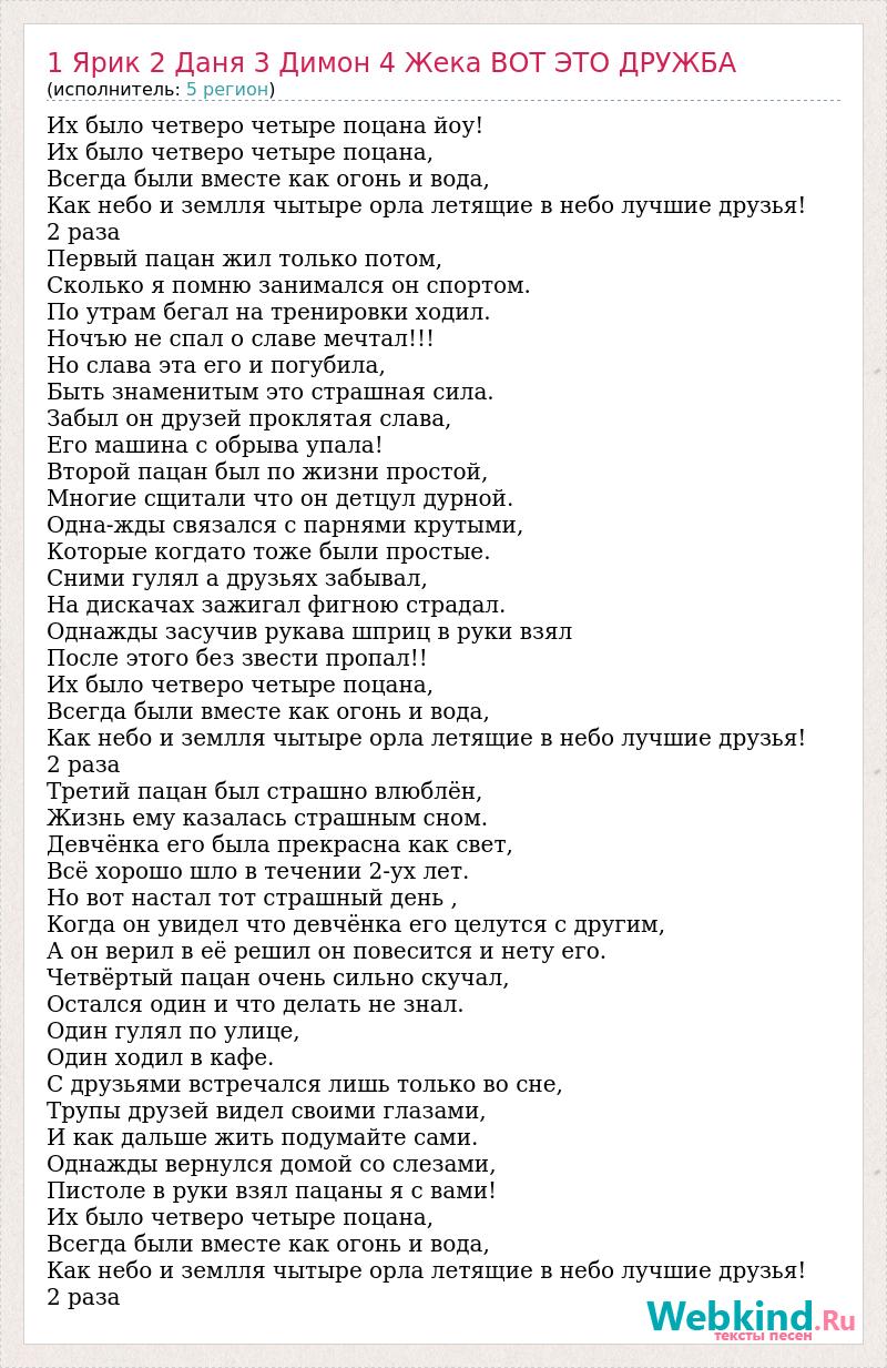 Их было четверо четыре поцана йоу! Их было четверо четыре поцана, Всегда были вместе как огонь и вода, Как небо и землля чытыре орла летящие в небо лучшие друзья! 2 раза Первый пацан жил только потом, Сколько я помню занимался он спортом. По утрам бегал на тренировки ходил. Ночъю не спал о славе мечтал!!! Но слава эта его и погубила, Быть знаменитым это страшная сила. Забыл он друзей проклятая слава, Его машина с обрыва упала! Второй пацан был по жизни простой, Многие сщитали что он детцул дурной. Одна-жды связался с парнями крутыми, Которые когдато тоже были простые. Сними гулял а друзьях забывал, На дискачах зажигал фигною страдал. Однажды засучив рукава шприц в руки взял После этого без звести пропал!! Их было четверо четыре поцана, Всегда были вместе как огонь и вода, Как небо и землля чытыре орла летящие в небо лучшие друзья! 2 раза Третий пацан был страшно влюблён, Жизнь ему казалась страшным сном. Девчёнка его была прекрасна как свет, Всё хорошо шло в течении 2-ух лет. Но вот настал тот страшный день , Когда он увидел что девчёнка его целутся с другим, А он верил в её решил он повесится и нету его. Четвёртый пацан очень сильно скучал, Остался один и что делать не знал. Один гулял по улице, Один ходил в кафе. С друзьями встречался лишь только во сне, Трупы друзей видел своими глазами, И как дальше жить подумайте сами. Однажды вернулся домой со слезами, Пистоле в руки взял пацаны я с вами! Их было четверо четыре поцана, Всегда были вместе как огонь и вода, Как небо и землля чытыре орла летящие в небо лучшие друзья! 2 раза