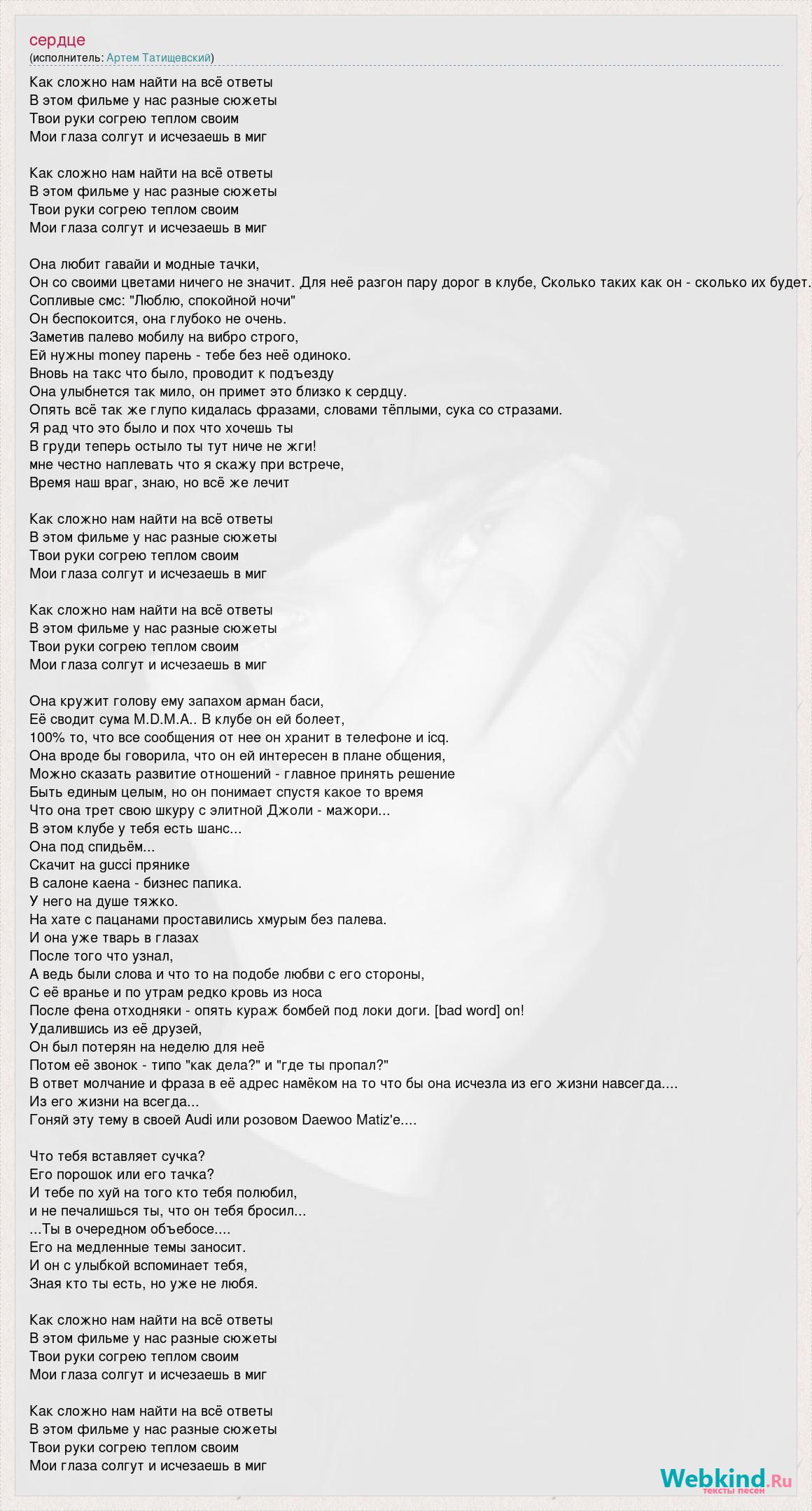 Как сложно нам найти на всё ответы В этом фильме у нас разные сюжеты Твои руки согрею теплом своим Мои глаза солгут и исчезаешь в миг Как сложно нам найти на всё ответы В этом фильме у нас разные сюжеты Твои руки согрею теплом своим Мои глаза солгут и исчезаешь в миг Она любит гавайи и модные тачки, Он со своими цветами ничего не значит. Для неё разгон пару дорог в клубе, Сколько таких как он - сколько их будет. Сопливые смс: "Люблю, спокойной ночи" Он беспокоится, она глубоко не очень. Заметив палево мобилу на вибро строго, Ей нужны money парень - тебе без неё одиноко. Вновь на такс что было, проводит к подъезду Она улыбнется так мило, он примет это близко к сердцу. Опять всё так же глупо кидалась фразами, словами тёплыми, сука со стразами. Я рад что это было и пох что хочешь ты В груди теперь остыло ты тут ниче не жги! мне честно наплевать что я скажу при встрече, Время наш враг, знаю, но всё же лечит Как сложно нам найти на всё ответы В этом фильме у нас разные сюжеты Твои руки согрею теплом своим Мои глаза солгут и исчезаешь в миг Как сложно нам найти на всё ответы В этом фильме у нас разные сюжеты Твои руки согрею теплом своим Мои глаза солгут и исчезаешь в миг Она кружит голову ему запахом арман баси, Её сводит сума M.D.M.A.. В клубе он ей болеет, 100% то, что все сообщения от нее он хранит в телефоне и icq. Она вроде бы говорила, что он ей интересен в плане общения, Можно сказать развитие отношений - главное принять решение Быть единым целым, но он понимает спустя какое то время Что она трет свою шкуру с элитной Джоли - мажори... В этом клубе у тебя есть шанс... Она под спидьём... Скачит на gucci прянике В салоне каена - бизнес папика. У него на душе тяжко. На хате с пацанами проставились хмурым без палева. И она уже тварь в глазах После того что узнал, А ведь были слова и что то на подобе любви с его стороны, С её вранье и по утрам редко кровь из носа После фена отходняки - опять кураж бомбей под локи доги. [bad word] on! Удалившись из её друзей, Он был потерян на неделю для неё Потом её звонок - типо "как дела?" и "где ты пропал?" В ответ молчание и фраза в её адрес намёком на то что бы она исчезла из его жизни навсегда.... Из его жизни на всегда... Гоняй эту тему в своей Audi или розовом Daewoo Matiz'е.... Что тебя вставляет сучка? Его порошок или его тачка? И тебе по хуй на того кто тебя полюбил, и не печалишься ты, что он тебя бросил... ...Ты в очередном объебосе.... Его на медленные темы заносит. И он с улыбкой вспоминает тебя, Зная кто ты есть, но уже не любя. Как сложно нам найти на всё ответы В этом фильме у нас разные сюжеты Твои руки согрею теплом своим Мои глаза солгут и исчезаешь в миг Как сложно нам найти на всё ответы В этом фильме у нас разные сюжеты Твои руки согрею теплом своим Мои глаза солгут и исчезаешь в миг