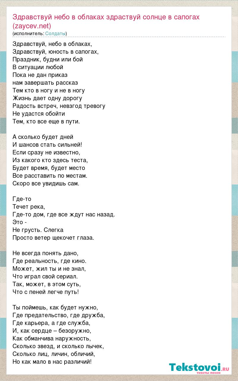 Здравствуй, небо в облаках, Здравствуй, юность в сапогах, Праздник, будни или бой В ситуации любой Пока не дан приказ нам завершать рассказ Тем кто в ногу и не в ногу Жизнь дает одну дорогу Радость встреч, невзгод тревогу Не удастся обойти Тем, кто все еще в пути. А сколько будет дней И шансов стать сильней! Если сразу не известно, Из какого кто здесь теста, Будет время, будет место Все расставить по местам. Скоро все увидишь сам. Где-то Течет река, Где-то дом, где все ждут нас назад. Это - Не грусть. Слегка Просто ветер щекочет глаза. Не всегда понять дано, Где реальность, где кино. Может, жил ты и не знал, Что играл свой сериал. Так, может, в этом суть, Что с пеней легче путь! Ты поймешь, как будет нужно, Где предательство, где дружба, Где карьера, а где служба, И, как сердце – безоружно, Как обманчива наружность, Сколько звезд, и сколько лычек, Сколько лиц, личин, обличий, Но как мало в нас различий!