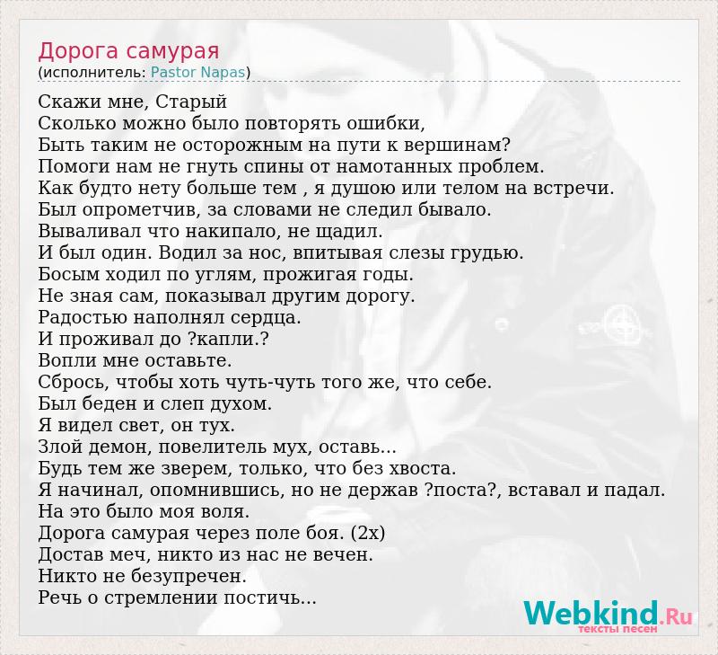 Скажи мне, Старый Сколько можно было повторять ошибки, Быть таким не осторожным на пути к вершинам? Помоги нам не гнуть спины от намотанных проблем. Как будто нету больше тем , я душою или телом на встречи. Был опрометчив, за словами не следил бывало. Вываливал что накипало, не щадил. И был один. Водил за нос, впитывая слезы грудью. Босым ходил по углям, прожигая годы. Не зная сам, показывал другим дорогу. Радостью наполнял сердца. И проживал до ?капли.? Вопли мне оставьте. Сбрось, чтобы хоть чуть-чуть того же, что себе. Был беден и слеп духом. Я видел свет, он тух. Злой демон, повелитель мух, оставь... Будь тем же зверем, только, что без хвоста. Я начинал, опомнившись, но не держав ?поста?, вставал и падал. На это было моя воля. Дорога самурая через поле боя. (2х) Достав меч, никто из нас не вечен. Никто не безупречен. Речь о стремлении постичь...