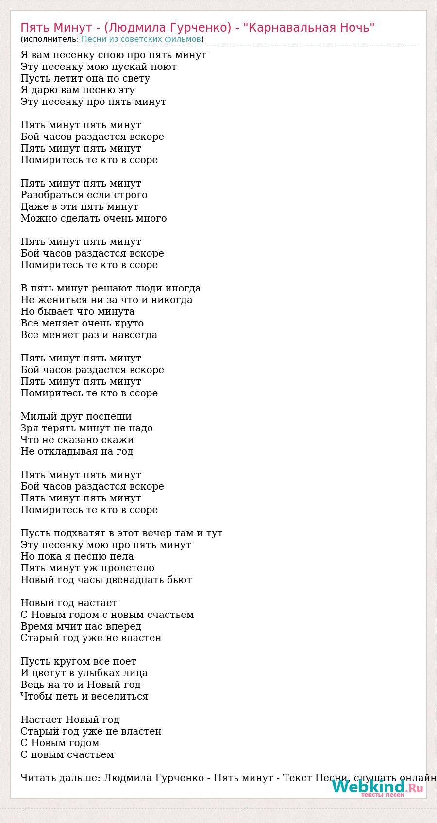 Я вам песенку спою про пять минут Эту песенку мою пускай поют Пусть летит она по свету Я дарю вам песню эту Эту песенку про пять минут Пять минут пять минут Бой часов раздастся вскоре Пять минут пять минут Помиритесь те кто в ссоре Пять минут пять минут Разобраться если строго Даже в эти пять минут Можно сделать очень много Пять минут пять минут Бой часов раздастся вскоре Помиритесь те кто в ссоре В пять минут решают люди иногда Не жениться ни за что и никогда Но бывает что минута Все меняет очень круто Все меняет раз и навсегда Пять минут пять минут Бой часов раздастся вскоре Пять минут пять минут Помиритесь те кто в ссоре Милый друг поспеши Зря терять минут не надо Что не сказано скажи Не откладывая на год Пять минут пять минут Бой часов раздастся вскоре Пять минут пять минут Помиритесь те кто в ссоре Пусть подхватят в этот вечер там и тут Эту песенку мою про пять минут Но пока я песню пела Пять минут уж пролетело Новый год часы двенадцать бьют Новый год настает С Новым годом с новым счастьем Время мчит нас вперед Старый год уже не властен Пусть кругом все поет И цветут в улыбках лица Ведь на то и Новый год Чтобы петь и веселиться Настает Новый год Старый год уже не властен С Новым годом С новым счастьем Читать дальше: Людмила Гурченко - Пять минут - Текст Песни, слушать онлайн