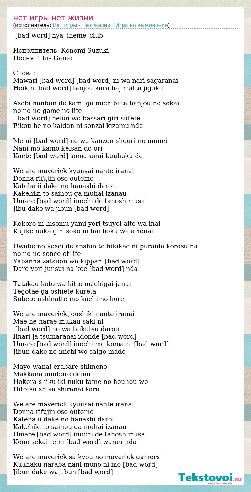 「 [bad word] nya_theme_club」 Исполнитель: Konomi Suzuki Песня: This Game Слова: Mawari [bad word] haguruma ni wa nari sagaranai Heikin [bad word] tanjou kara hajimatta jigoku Asobi hanbun de kami ga michibiita banjou no sekai no no no game no life [bad word] heion wo bassari giri sutete Eikou he no kaidan ni sonzai kizamu nda Me ni [bad word] no wa kanzen shouri no unmei Nani mo kamo keisan do ori Kaete [bad word] somaranai kuuhaku de We are maverick kyuusai nante iranai Donna rifujin oso outomo Kateba ii dake no hanashi darou Kakehiki to sainou ga muhai izanau Umare [bad word] inochi de tanoshimusa Jibu dake wa jibun [bad word] Kokoro ni hisomu yami yori tsuyoi aite wa inai Kujike nuka giri soko ni hai boku wa arienai Uwabe no kosei de anshin to hikikae ni puraido korosu na no no no sence of life Yabanna zatsuon wo kippari [bad word] Dare yori junsui na koe [bad word] nda Tatakau koto wa kitto machigai janai Tegotae ga oshiete kureta Subete ushinatte mo kachi no kore We are maverick joushiki nante iranai Mae he narae mukau saki ni [bad word] no wa taikutsu darou Iinari ja tsumaranai idonde [bad word] Umare [bad word] inochi mo koma ni [bad word] Jibun dake no michi wo saigo made Mayo wanai erabare shimono Makkana unubore demo Hokora shiku iki nuku tame no houhou wo Hitotsu shika shiranai kara We are maverick kyuusai nante iranai Donna rifujin oso outomo Kateba ii dake no hanashi darou Kakehiki to sainou ga muhai izanau Umare [bad word] inochi de tanoshimusa Kono sekai te ni [bad word] warau nda We are maverick saikyou no maverick gamers Kuuhaku naraba nani mono ni mo [bad word] Jibun dake wa jibun [bad word]