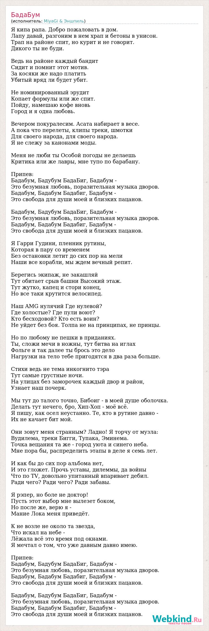 Я кипа рапа. Добро пожаловать в дом. Лапу давай, разгоним в нем храп и бетоны в унисон. Трап на районе спит, но курит и не говорит. Дикого ты не буди. Ведь на районе каждый бандит Сидит и помнит этот мотив. За косяки же надо платить Убитый вряд ли будет убит. Не номинированный эрудит Копает формулы или же спит. Пойду, намешаю кофе вновь Город и я одна любовь. Вечером покуралесим. Асата набирает в весе. А пока что перелеты, клипы треки, шмотки Для своего народа, для своего народа. Я не слежу за канонами моды. Меня не люби ты Особой погоды не делаешь Критика или же лавры, мне тупо по барабану. Припев: Бадабум, Бадубум БадаБиг, Бадабум - Это безумная любовь, поразительная музыка дворов. Бадабум, Бадабум Бадабиг, Бадабум - Это свобода для души моей и близких пацанов. Бадабум, Бадубум БадаБиг, Бадабум - Это безумная любовь, поразительная музыка дворов. Бадабум, Бадабум Бадабиг, Бадабум - Это свобода для души моей и близких пацанов. Я Гарри Гудини, пленник рутины, Которая в пару со временем Без остановки летит до сих пор на мели Наши все корабли, мы ждем вечный репит. Берегись экипаж, не закашляй Тут обитает срыв башни Высокий этаж. Тут жутко, капец и стори конец, Но все таки крутится велосипед. Наш AMG нулячий Где нулевой? Где холостые? Где пули воют? Кто бесходовой? Кто есть воин? Не уйдет без боя. Толпа не на принципах, не принцы. Но по любому не пешки в приданиях. Ты, сложи мечи в ножны, тут битва на иглах Фольге и так далее ты брось это дело Нагрузки на тело тебе пригодятся в два раза больше. Стихи ведь не тема инкогнито тэра Тут самые грустные ночи. На улицах без заморочек каждый двор и район, Узнает наш почерк. Мы тут до талого точно, Бибоиг - в моей душе оболочка. Делать тут нечего, бро, Хип-Хоп - моё всё. Я пишу, как осел неустанно. Те, кто в рутине давно - Их не качает бит мой. Они зовут меня странным? Ладно! Я торчу от музла: Вудилема, треки Бигги, Тупака, Эминема. Точка вещания та же - город уюта и синего неба. Мне пора бы, распределить этапы в деле я семь лет. И как бы до сих пор альбома нет, И это гложет. Прочь уставы, дилеммы, да войны Что по TV, довольно упитанный впаривает дебил. Ради чего? Ради чего? Ради забавы. Я рэпер, но боле не доктор! Пусть этот выбор мне вылезет боком, Но после же, верю я - Мание Лока меня приведёт. К не возле не около та звезда, Что искал на небе - Лёжала всё это время под окнами. Я мечтал о том, что уже давным давно имею. Припев: Бадабум, Бадубум БадаБиг, Бадабум - Это безумная любовь, поразительная музыка дворов. Бадабум, Бадабум Бадабиг, Бадабум - Это свобода для души моей и близких пацанов. Бадабум, Бадубум БадаБиг, Бадабум - Это безумная любовь, поразительная музыка дворов. Бадабум, Бадабум Бадабиг, Бадабум - Это свобода для души моей и близких пацанов.