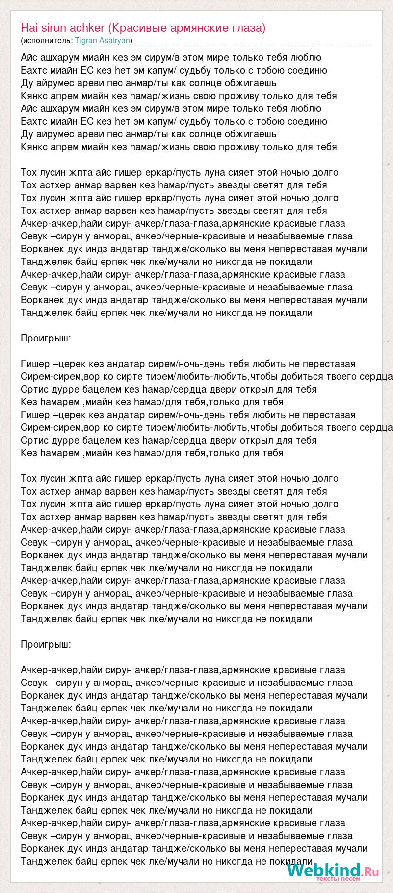 Айс ашхарум миайн кез эм сирум/в этом мире только тебя люблю Бахтс миайн ЕС кез hет эм капум/ судьбу только с тобою соединю Ду айрумес ареви пес анмар/ты как солнце обжигаешь Кянкс апрем миайн кез hамар/жизнь свою проживу только для тебя Айс ашхарум миайн кез эм сирум/в этом мире только тебя люблю Бахтс миайн ЕС кез hет эм капум/ судьбу только с тобою соединю Ду айрумес ареви пес анмар/ты как солнце обжигаешь Кянкс апрем миайн кез hамар/жизнь свою проживу только для тебя Тох лусин жпта айс гишер еркар/пусть луна сияет этой ночью долго Тох астхер анмар варвен кез hамар/пусть звезды светят для тебя Тох лусин жпта айс гишер еркар/пусть луна сияет этой ночью долго Тох астхер анмар варвен кез hамар/пусть звезды светят для тебя Ачкер-ачкер,hайи сирун ачкер/глаза-глаза,армянские красивые глаза Севук –сирун у анморац ачкер/черные-красивые и незабываемые глаза Ворканек дук индз андатар тандже/сколько вы меня непереставая мучали Танджелек байц ерпек чек лке/мучали но никогда не покидали Ачкер-ачкер,hайи сирун ачкер/глаза-глаза,армянские красивые глаза Севук –сирун у анморац ачкер/черные-красивые и незабываемые глаза Ворканек дук индз андатар тандже/сколько вы меня непереставая мучали Танджелек байц ерпек чек лке/мучали но никогда не покидали Проигрыш: Гишер –церек кез андатар сирем/ночь-день тебя любить не переставая Сирем-сирем,вор ко сирте тирем/любить-любить,чтобы добиться твоего сердца Сртис дурре бацелем кез hамар/сердца двери открыл для тебя Кез hамарем ,миайн кез hамар/для тебя,только для тебя Гишер –церек кез андатар сирем/ночь-день тебя любить не переставая Сирем-сирем,вор ко сирте тирем/любить-любить,чтобы добиться твоего сердца Сртис дурре бацелем кез hамар/сердца двери открыл для тебя Кез hамарем ,миайн кез hамар/для тебя,только для тебя Тох лусин жпта айс гишер еркар/пусть луна сияет этой ночью долго Тох астхер анмар варвен кез hамар/пусть звезды светят для тебя Тох лусин жпта айс гишер еркар/пусть луна сияет этой ночью долго Тох астхер анмар варвен кез hамар/пусть звезды светят для тебя Ачкер-ачкер,hайи сирун ачкер/глаза-глаза,армянские красивые глаза Севук –сирун у анморац ачкер/черные-красивые и незабываемые глаза Ворканек дук индз андатар тандже/сколько вы меня непереставая мучали Танджелек байц ерпек чек лке/мучали но никогда не покидали Ачкер-ачкер,hайи сирун ачкер/глаза-глаза,армянские красивые глаза Севук –сирун у анморац ачкер/черные-красивые и незабываемые глаза Ворканек дук индз андатар тандже/сколько вы меня непереставая мучали Танджелек байц ерпек чек лке/мучали но никогда не покидали Проигрыш: Ачкер-ачкер,hайи сирун ачкер/глаза-глаза,армянские красивые глаза Севук –сирун у анморац ачкер/черные-красивые и незабываемые глаза Ворканек дук индз андатар тандже/сколько вы меня непереставая мучали Танджелек байц ерпек чек лке/мучали но никогда не покидали Ачкер-ачкер,hайи сирун ачкер/глаза-глаза,армянские красивые глаза Севук –сирун у анморац ачкер/черные-красивые и незабываемые глаза Ворканек дук индз андатар тандже/сколько вы меня непереставая мучали Танджелек байц ерпек чек лке/мучали но никогда не покидали Ачкер-ачкер,hайи сирун ачкер/глаза-глаза,армянские красивые глаза Севук –сирун у анморац ачкер/черные-красивые и незабываемые глаза Ворканек дук индз андатар тандже/сколько вы меня непереставая мучали Т