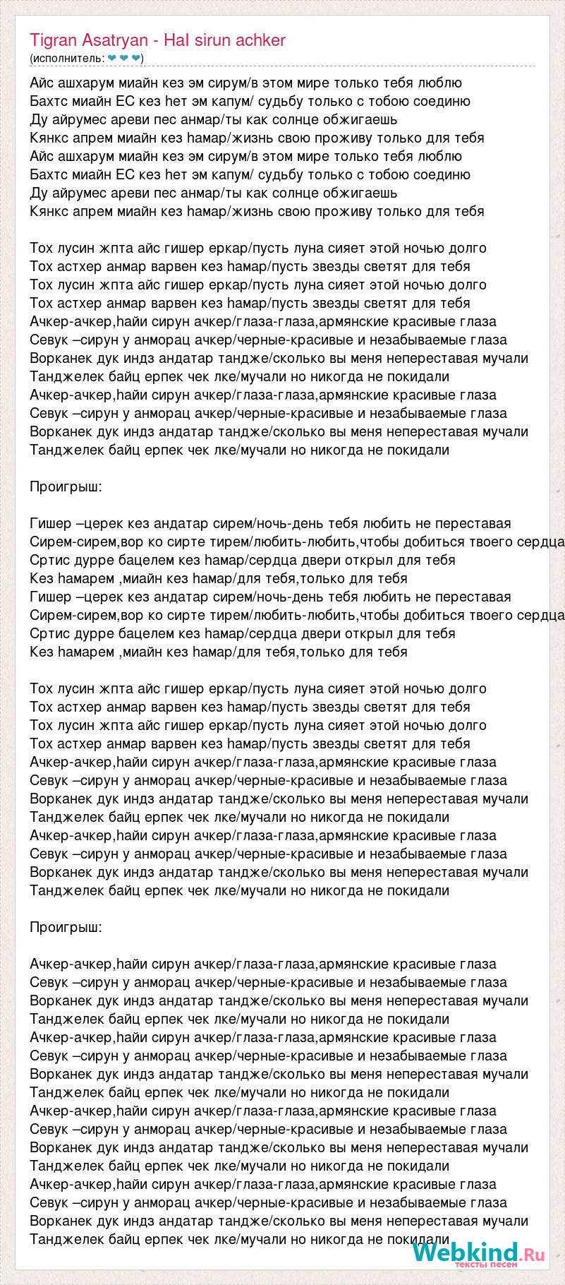 Айс ашхарум миайн кез эм сирум/в этом мире только тебя люблю Бахтс миайн ЕС кез hет эм капум/ судьбу только с тобою соединю Ду айрумес ареви пес анмар/ты как солнце обжигаешь Кянкс апрем миайн кез hамар/жизнь свою проживу только для тебя Айс ашхарум миайн кез эм сирум/в этом мире только тебя люблю Бахтс миайн ЕС кез hет эм капум/ судьбу только с тобою соединю Ду айрумес ареви пес анмар/ты как солнце обжигаешь Кянкс апрем миайн кез hамар/жизнь свою проживу только для тебя Тох лусин жпта айс гишер еркар/пусть луна сияет этой ночью долго Тох астхер анмар варвен кез hамар/пусть звезды светят для тебя Тох лусин жпта айс гишер еркар/пусть луна сияет этой ночью долго Тох астхер анмар варвен кез hамар/пусть звезды светят для тебя Ачкер-ачкер,hайи сирун ачкер/глаза-глаза,армянские красивые глаза Севук –сирун у анморац ачкер/черные-красивые и незабываемые глаза Ворканек дук индз андатар тандже/сколько вы меня непереставая мучали Танджелек байц ерпек чек лке/мучали но никогда не покидали Ачкер-ачкер,hайи сирун ачкер/глаза-глаза,армянские красивые глаза Севук –сирун у анморац ачкер/черные-красивые и незабываемые глаза Ворканек дук индз андатар тандже/сколько вы меня непереставая мучали Танджелек байц ерпек чек лке/мучали но никогда не покидали Проигрыш: Гишер –церек кез андатар сирем/ночь-день тебя любить не переставая Сирем-сирем,вор ко сирте тирем/любить-любить,чтобы добиться твоего сердца Сртис дурре бацелем кез hамар/сердца двери открыл для тебя Кез hамарем ,миайн кез hамар/для тебя,только для тебя Гишер –церек кез андатар сирем/ночь-день тебя любить не переставая Сирем-сирем,вор ко сирте тирем/любить-любить,чтобы добиться твоего сердца Сртис дурре бацелем кез hамар/сердца двери открыл для тебя Кез hамарем ,миайн кез hамар/для тебя,только для тебя Тох лусин жпта айс гишер еркар/пусть луна сияет этой ночью долго Тох астхер анмар варвен кез hамар/пусть звезды светят для тебя Тох лусин жпта айс гишер еркар/пусть луна сияет этой ночью долго Тох астхер анмар варвен кез hамар/пусть звезды светят для тебя Ачкер-ачкер,hайи сирун ачкер/глаза-глаза,армянские красивые глаза Севук –сирун у анморац ачкер/черные-красивые и незабываемые глаза Ворканек дук индз андатар тандже/сколько вы меня непереставая мучали Танджелек байц ерпек чек лке/мучали но никогда не покидали Ачкер-ачкер,hайи сирун ачкер/глаза-глаза,армянские красивые глаза Севук –сирун у анморац ачкер/черные-красивые и незабываемые глаза Ворканек дук индз андатар тандже/сколько вы меня непереставая мучали Танджелек байц ерпек чек лке/мучали но никогда не покидали Проигрыш: Ачкер-ачкер,hайи сирун ачкер/глаза-глаза,армянские красивые глаза Севук –сирун у анморац ачкер/черные-красивые и незабываемые глаза Ворканек дук индз андатар тандже/сколько вы меня непереставая мучали Танджелек байц ерпек чек лке/мучали но никогда не покидали Ачкер-ачкер,hайи сирун ачкер/глаза-глаза,армянские красивые глаза Севук –сирун у анморац ачкер/черные-красивые и незабываемые глаза Ворканек дук индз андатар тандже/сколько вы меня непереставая мучали Танджелек байц ерпек чек лке/мучали но никогда не покидали Ачкер-ачкер,hайи сирун ачкер/глаза-глаза,армянские красивые глаза Севук –сирун у анморац ачкер/черные-красивые и незабываемые глаза Ворканек дук индз андатар тандже/сколько вы меня непереставая мучали Т
