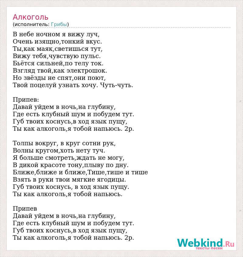 В небе ночном я вижу луч, Очень изящно,тонкий вкус. Ты,как маяк,светишься тут, Вижу тебя,чувствую пульс. Бьётся сильней,по телу ток. Взгляд твой,как электрошок. Но звёзды не спят,они поют, Твой поцелуй узнать хочу. Чуть-чуть. Припев: Давай уйдем в ночь,на глубину, Где есть клубный шум и побудем тут. Губ твоих коснусь,в ход язык пущу, Ты как алкоголь,я тобой напьюсь. 2р. Толпы вокруг, в круг сотни рук, Волны кругом,хоть нету туч. Я больше смотреть,ждать не могу, В дикой красоте тону,плыву по дну. Ближе,ближе и ближе,Тише,тише и тише Взять в руки твои мягкие ягодицы. Губ твоих коснусь, в ход язык пущу. Ты как алкоголь,я тобой напьюсь. Припев Давай уйдем в ночь,на глубину, Где есть клубный шум и побудем тут. Губ твоих коснусь,в ход язык пущу, Ты как алкоголь,я тобой напьюсь. 2р.