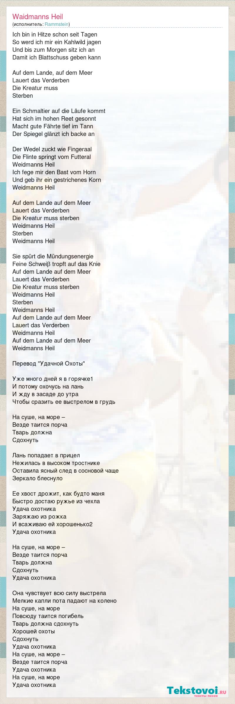 Ich bin in Hitze schon seit Tagen So werd ich mir ein Kahlwild jagen Und bis zum Morgen sitz ich an Damit ich Blattschuss geben kann Auf dem Lande, auf dem Meer Lauert das Verderben Die Kreatur muss Sterben Ein Schmaltier auf die Läufe kommt Hat sich im hohen Reet gesonnt Macht gute Fährte tief im Tann Der Spiegel glänzt ich backe an Der Wedel zuckt wie Fingeraal Die Flinte springt vom Futteral Weidmanns Heil Ich fege mir den Bast vom Horn Und geb ihr ein gestrichenes Korn Weidmanns Heil Auf dem Lande auf dem Meer Lauert das Verderben Die Kreatur muss sterben Weidmanns Heil Sterben Weidmanns Heil Sie spürt die Mündungsenergie Feine Schweiβ tropft auf das Knie Auf dem Lande auf dem Meer Lauert das Verderben Die Kreatur muss sterben Weidmanns Heil Sterben Weidmanns Heil Auf dem Lande auf dem Meer Lauert das Verderben Weidmanns Heil Auf dem Lande auf dem Meer Weidmanns Heil Перевод "Удачной Охоты" Уже много дней я в горячке1 И потому охочусь на лань И жду в засаде до утра Чтобы сразить ее выстрелом в грудь На суше, на море – Везде таится порча Тварь должна Cдохнуть Лань попадает в прицел Нежилась в высоком тростнике Оставила ясный след в сосновой чаще Зеркало блеснуло Ее хвост дрожит, как будто маня Быстро достаю ружье из чехла Удача охотника Заряжаю из рожка И всаживаю ей хорошенько2 Удача охотника На суше, на море – Везде таится порча Тварь должна Сдохнуть Удача охотника Она чувствует всю силу выстрела Мелкие капли пота падают на колено На суше, на море Повсюду таится погибель Тварь должна сдохнуть Хорошей охоты Сдохнуть Удача охотника На суше, на море – Везде таится порча Удача охотника На суше, на море Удача охотника