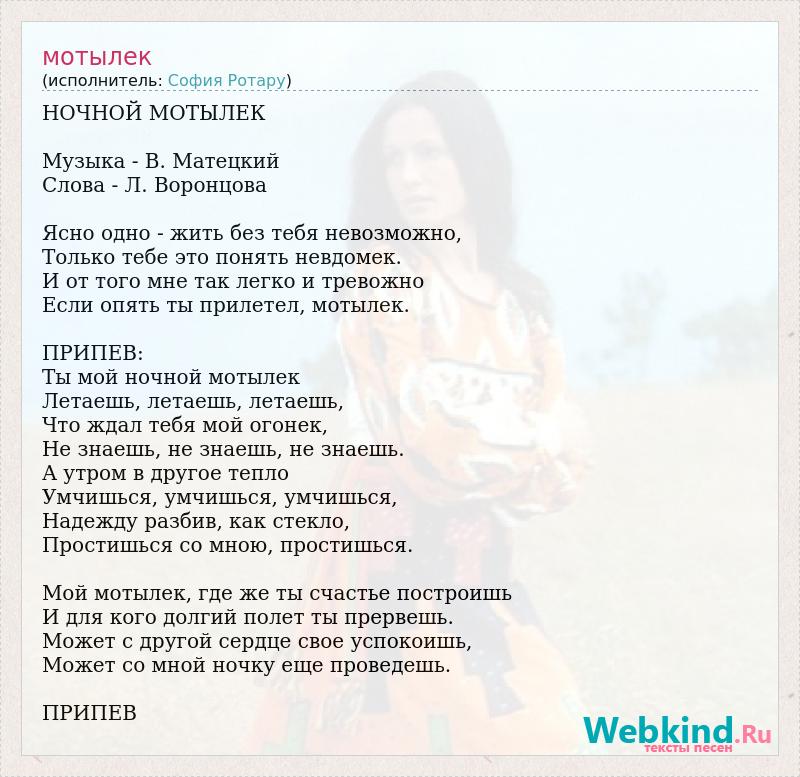 НОЧНОЙ МОТЫЛЕК Музыка - В. Матецкий Слова - Л. Воронцова Ясно одно - жить без тебя невозможно, Только тебе это понять невдомек. И от того мне так легко и тревожно Если опять ты прилетел, мотылек. ПРИПЕВ: Ты мой ночной мотылек Летаешь, летаешь, летаешь, Что ждал тебя мой огонек, Не знаешь, не знаешь, не знаешь. А утром в другое тепло Умчишься, умчишься, умчишься, Надежду разбив, как стекло, Простишься со мною, простишься. Мой мотылек, где же ты счастье построишь И для кого долгий полет ты прервешь. Может с другой сердце свое успокоишь, Может со мной ночку еще проведешь. ПРИПЕВ