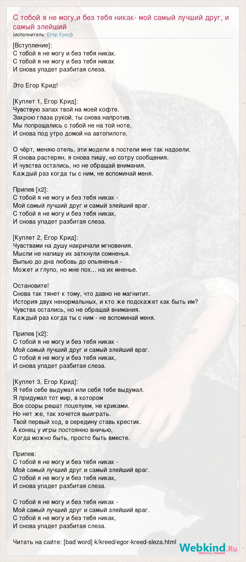 [Вступление]: С тобой я не могу и без тебя никак. С тобой я не могу и без тебя никак И снова упадет разбитая слеза. Это Егор Крид! [Куплет 1, Егор Крид]: Чувствую запах твой на моей кофте. Закрою глаза рукой, ты снова напротив. Мы попрощались с тобой не на той ноте, И снова под утро домой на автопилоте. О чёрт, меняю отель, эти модели в постели мне так надоели. Я снова растерян, я снова пишу, но сотру сообщения. И чувства остались, но не обращай внимания. Каждый раз когда ты с ним, не вспоминай меня. Припев [x2]: С тобой я не могу и без тебя никак - Мой самый лучший друг и самый злейший враг. С тобой я не могу и без тебя никак, И снова упадет разбитая слеза. [Куплет 2, Егор Крид]: Чувствами на душу накричали мгновения. Мысли не напишу их заткнули сомненья. Выпью до дна любовь до опьяненья - Может и глупо, но мне пох... на их мненье. Остановите! Снова так тянет к тому, что давно не магнитит. История двух ненормальных, и кто же подскажет как быть им? Чувства остались, но не обращай внимания. Каждый раз когда ты с ним - не вспоминай меня. Припев [x2]: С тобой я не могу и без тебя никак - Мой самый лучший друг и самый злейший враг. С тобой я не могу и без тебя никак, И снова упадет разбитая слеза. [Куплет 3, Егор Крид]: Я тебя себе выдумал или себя тебе выдумал. Я придумал тот мир, в котором Все ссоры решат поцелуем, не криками. Но нет же, так хочется выиграть. Твой первый ход, в середину ставь крестик. А конец у игры постоянно вничью, Когда можно быть, просто быть вместе. Припев: С тобой я не могу и без тебя никак - Мой самый лучший друг и самый злейший враг. С тобой я не могу и без тебя никак, И снова упадет разбитая слеза. С тобой я не могу и без тебя никак - Мой самый лучший друг и самый злейший враг. С тобой я не могу и без тебя никак, И снова упадет разбитая слеза. Читать на сайте: [bad word] k/kreed/egor-kreed-sleza.html