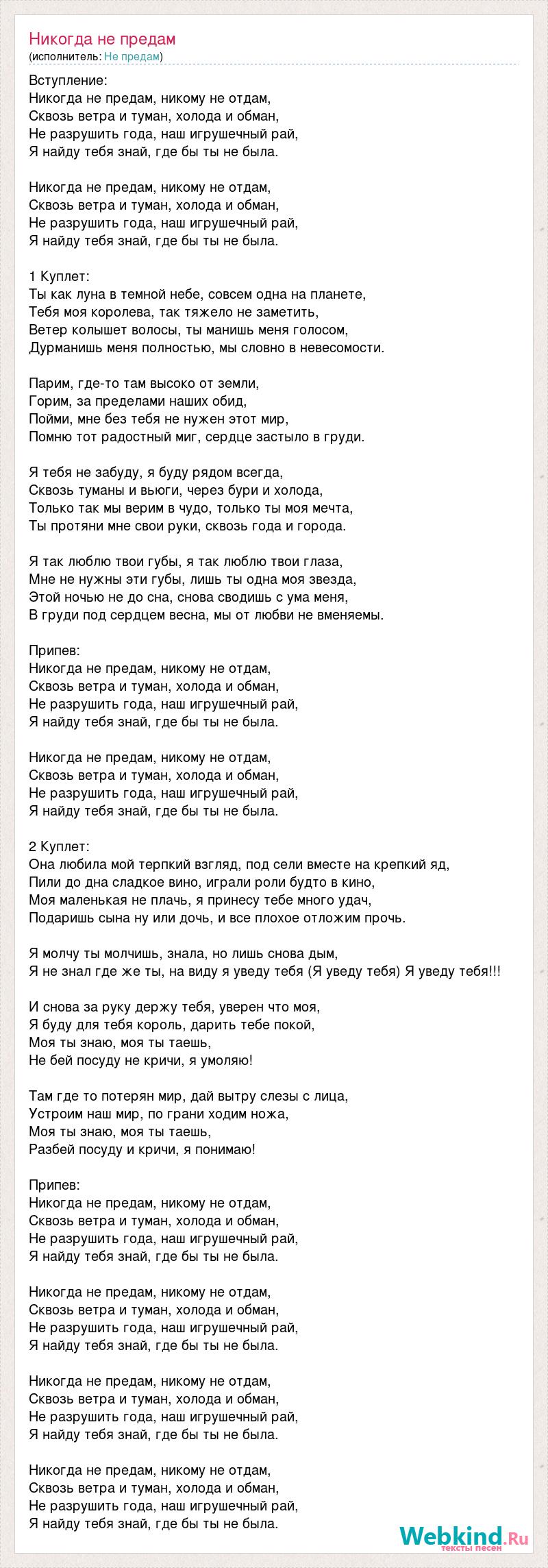 Вступление: Никогда не предам, никому не отдам, Сквозь ветра и туман, холода и обман, Не разрушить года, наш игрушечный рай, Я найду тебя знай, где бы ты не была. Никогда не предам, никому не отдам, Сквозь ветра и туман, холода и обман, Не разрушить года, наш игрушечный рай, Я найду тебя знай, где бы ты не была. 1 Куплет: Ты как луна в темной небе, совсем одна на планете, Тебя моя королева, так тяжело не заметить, Ветер колышет волосы, ты манишь меня голосом, Дурманишь меня полностью, мы словно в невесомости. Парим, где-то там высоко от земли, Горим, за пределами наших обид, Пойми, мне без тебя не нужен этот мир, Помню тот радостный миг, сердце застыло в груди. Я тебя не забуду, я буду рядом всегда, Сквозь туманы и вьюги, через бури и холода, Только так мы верим в чудо, только ты моя мечта, Ты протяни мне свои руки, сквозь года и города. Я так люблю твои губы, я так люблю твои глаза, Мне не нужны эти губы, лишь ты одна моя звезда, Этой ночью не до сна, снова сводишь с ума меня, В груди под сердцем весна, мы от любви не вменяемы. Припев: Никогда не предам, никому не отдам, Сквозь ветра и туман, холода и обман, Не разрушить года, наш игрушечный рай, Я найду тебя знай, где бы ты не была. Никогда не предам, никому не отдам, Сквозь ветра и туман, холода и обман, Не разрушить года, наш игрушечный рай, Я найду тебя знай, где бы ты не была. 2 Куплет: Она любила мой терпкий взгляд, под сели вместе на крепкий яд, Пили до дна сладкое вино, играли роли будто в кино, Моя маленькая не плачь, я принесу тебе много удач, Подаришь сына ну или дочь, и все плохое отложим прочь. Я молчу ты молчишь, знала, но лишь снова дым, Я не знал где же ты, на виду я уведу тебя (Я уведу тебя) Я уведу тебя!!! И снова за руку держу тебя, уверен что моя, Я буду для тебя король, дарить тебе покой, Моя ты знаю, моя ты таешь, Не бей посуду не кричи, я умоляю! Там где то потерян мир, дай вытру слезы с лица, Устроим наш мир, по грани ходим ножа, Моя ты знаю, моя ты таешь, Разбей посуду и кричи, я понимаю! Припев: Никогда не предам, никому не отдам, Сквозь ветра и туман, холода и обман, Не разрушить года, наш игрушечный рай, Я найду тебя знай, где бы ты не была. Никогда не предам, никому не отдам, Сквозь ветра и туман, холода и обман, Не разрушить года, наш игрушечный рай, Я найду тебя знай, где бы ты не была. Никогда не предам, никому не отдам, Сквозь ветра и туман, холода и обман, Не разрушить года, наш игрушечный рай, Я найду тебя знай, где бы ты не была. Никогда не предам, никому не отдам, Сквозь ветра и туман, холода и обман, Не разрушить года, наш игрушечный рай, Я найду тебя знай, где бы ты не была.