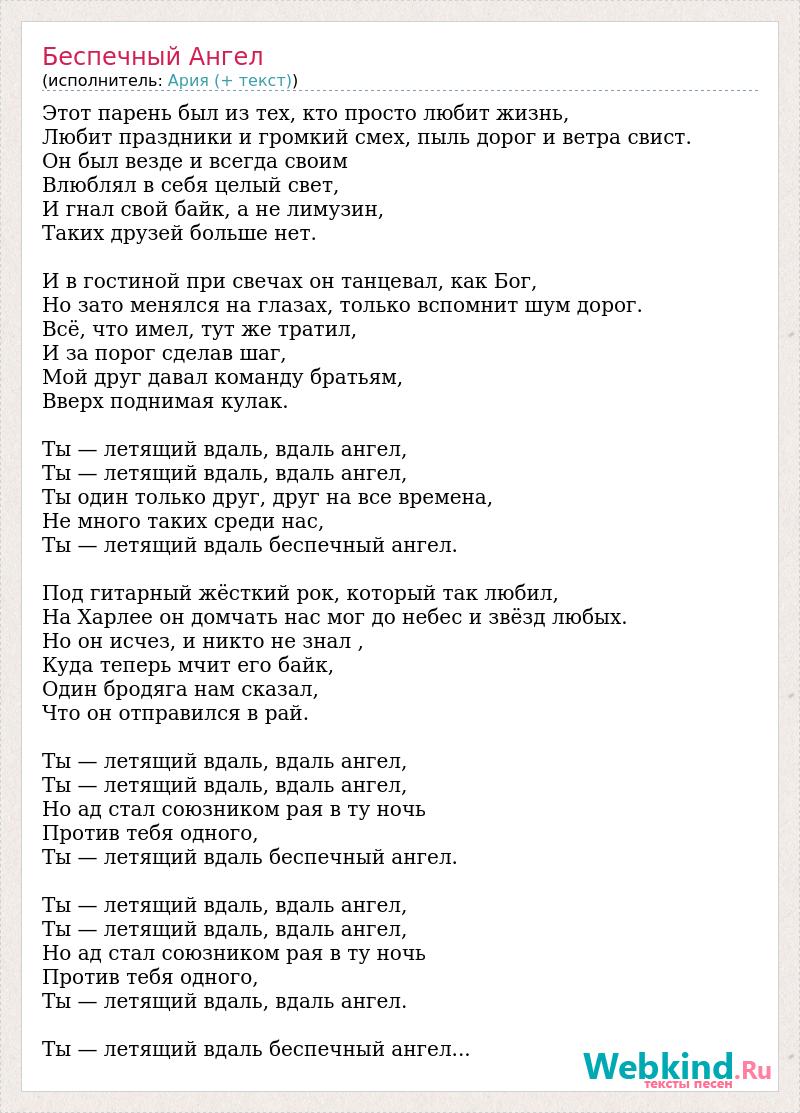 Этот парень был из тех, кто просто любит жизнь, Любит праздники и громкий смех, пыль дорог и ветра свист. Он был везде и всегда своим Влюблял в себя целый свет, И гнал свой байк, а не лимузин, Таких друзей больше нет. И в гостиной при свечах он танцевал, как Бог, Но зато менялся на глазах, только вспомнит шум дорог. Всё, что имел, тут же тратил, И за порог сделав шаг, Мой друг давал команду братьям, Вверх поднимая кулак. Ты — летящий вдаль, вдаль ангел, Ты — летящий вдаль, вдаль ангел, Ты один только друг, друг на все времена, Не много таких среди нас, Ты — летящий вдаль беспечный ангел. Под гитарный жёсткий рок, который так любил, На Харлее он домчать нас мог до небес и звёзд любых. Но он исчез, и никто не знал , Куда теперь мчит его байк, Один бродяга нам сказал, Что он отправился в рай. Ты — летящий вдаль, вдаль ангел, Ты — летящий вдаль, вдаль ангел, Но ад стал союзником рая в ту ночь Против тебя одного, Ты — летящий вдаль беспечный ангел. Ты — летящий вдаль, вдаль ангел, Ты — летящий вдаль, вдаль ангел, Но ад стал союзником рая в ту ночь Против тебя одного, Ты — летящий вдаль, вдаль ангел. Ты — летящий вдаль беспечный ангел...