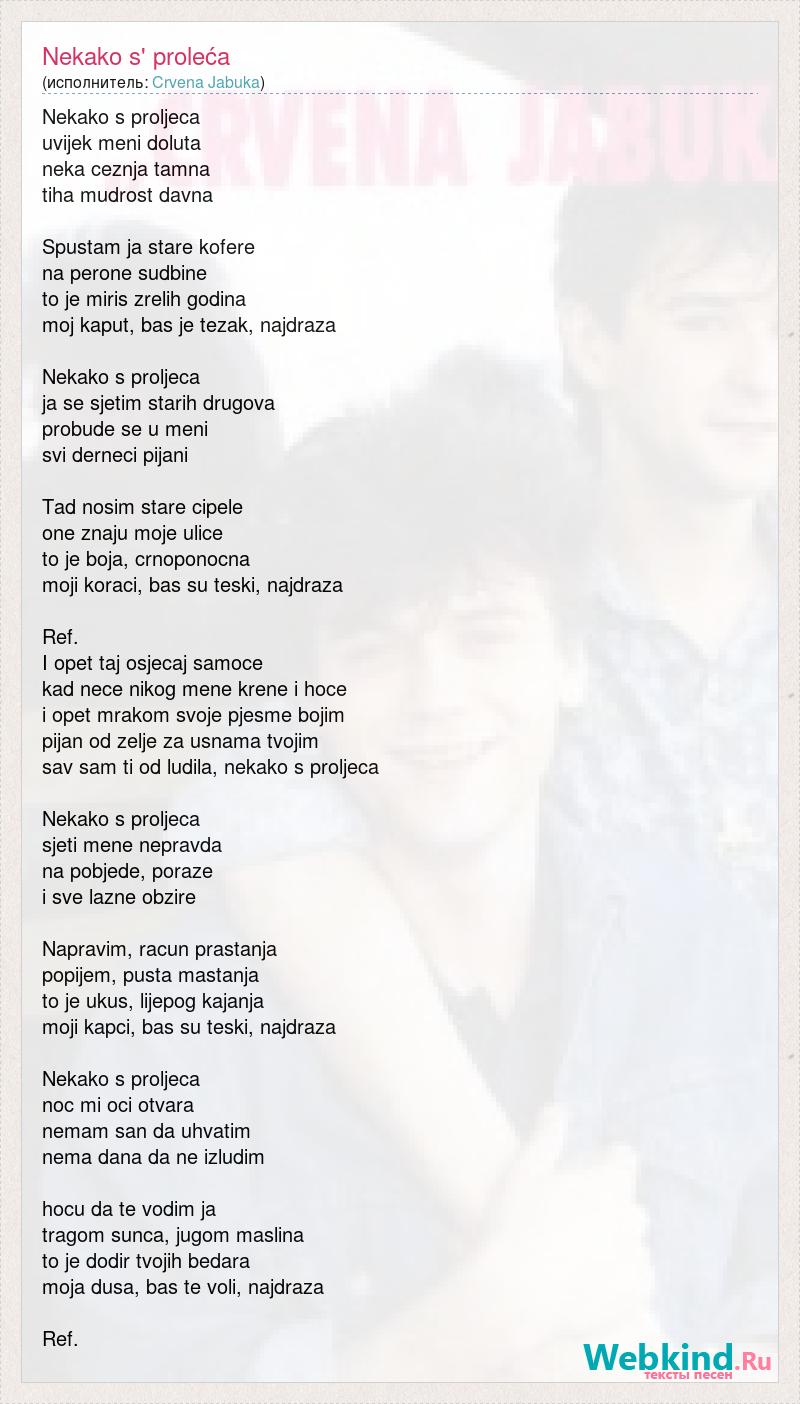 Nekako s proljeca uvijek meni doluta neka ceznja tamna tiha mudrost davna Spustam ja stare kofere na perone sudbine to je miris zrelih godina moj kaput, bas je tezak, najdraza Nekako s proljeca ja se sjetim starih drugova probude se u meni svi derneci pijani Tad nosim stare cipele one znaju moje ulice to je boja, crnoponocna moji koraci, bas su teski, najdraza Ref. I opet taj osjecaj samoce kad nece nikog mene krene i hoce i opet mrakom svoje pjesme bojim pijan od zelje za usnama tvojim sav sam ti od ludila, nekako s proljeca Nekako s proljeca sjeti mene nepravda na pobjede, poraze i sve lazne obzire Napravim, racun prastanja popijem, pusta mastanja to je ukus, lijepog kajanja moji kapci, bas su teski, najdraza Nekako s proljeca noc mi oci otvara nemam san da uhvatim nema dana da ne izludim hocu da te vodim ja tragom sunca, jugom maslina to je dodir tvojih bedara moja dusa, bas te voli, najdraza Ref.