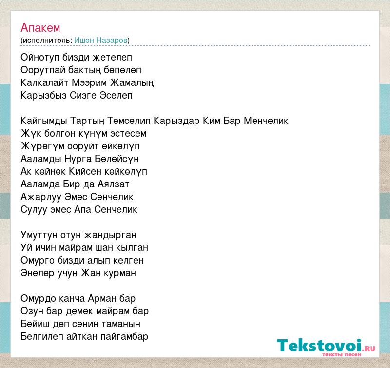 Ойнотуп бизди жетелеп Оорутпай бактың бөпөлөп Калкалайт Мээрим Жамалың Карызбыз Сизге Эселеп Кайгымды Тартың Темселип Карыздар Ким Бар Менчелик Жүк болгон күнүм эстесем Жүрөгүм ооруйт өйкөлүп Ааламды Нурга Бөлөйсүн Ак көйнөк Кийсен көйкөлүп Ааламда Бир да Аялзат Ажарлуу Эмес Сенчелик Сулуу эмес Апа Сенчелик Умуттун отун жандырган Уй ичин майрам шан кылган Омурго бизди алып келген Энелер учун Жан курман Омурдо канча Арман бар Озун бар демек майрам бар Бейиш деп сенин таманын Белгилеп айткан пайгамбар