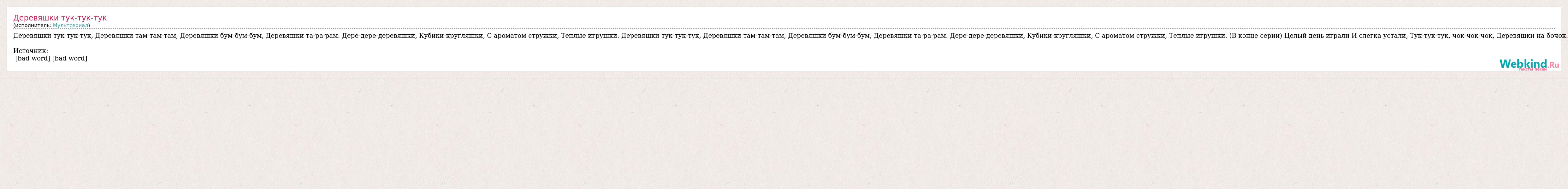 Деревяшки тук-тук-тук, Деревяшки там-там-там, Деревяшки бум-бум-бум, Деревяшки та-ра-рам. Дере-дере-деревяшки, Кубики-кругляшки, С ароматом стружки, Теплые игрушки. Деревяшки тук-тук-тук, Деревяшки там-там-там, Деревяшки бум-бум-бум, Деревяшки та-ра-рам. Дере-дере-деревяшки, Кубики-кругляшки, С ароматом стружки, Теплые игрушки. (В конце серии) Целый день играли И слегка устали, Тук-тук-тук, чок-чок-чок, Деревяшки на бочок. Источник: [bad word] [bad word]