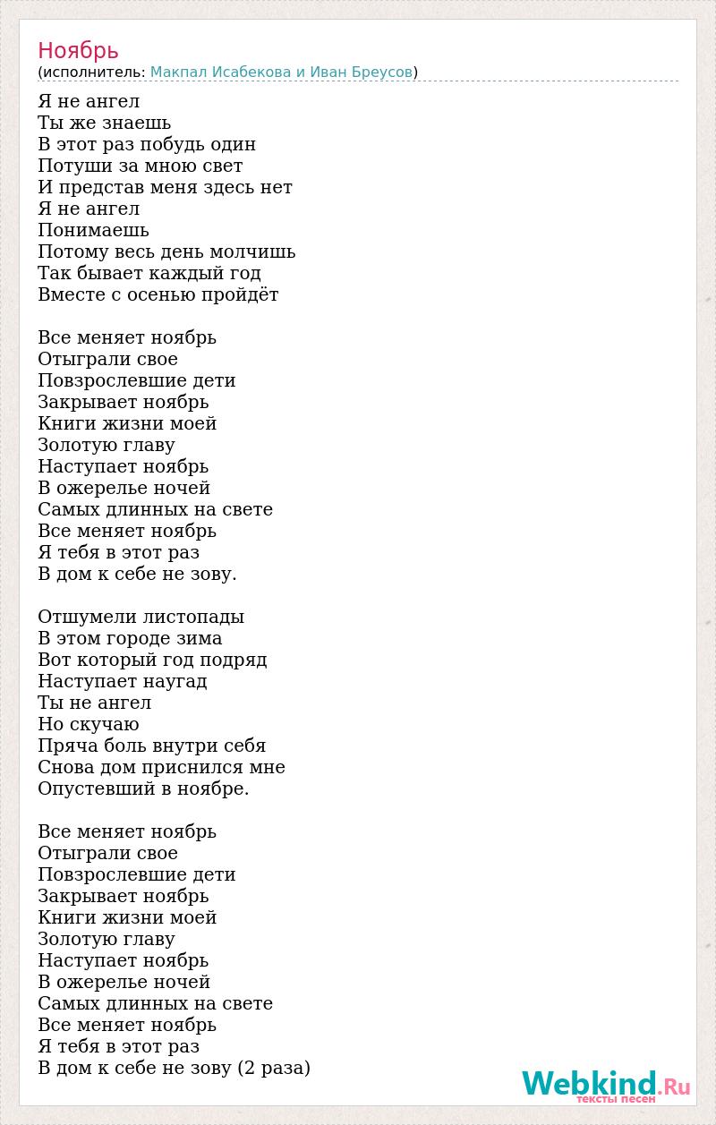 Я не ангел Ты же знаешь В этот раз побудь один Потуши за мною свет И представ меня здесь нет Я не ангел Понимаешь Потому весь день молчишь Так бывает каждый год Вместе с осенью пройдёт Все меняет ноябрь Отыграли свое Повзрослевшие дети Закрывает ноябрь Книги жизни моей Золотую главу Наступает ноябрь В ожерелье ночей Самых длинных на свете Все меняет ноябрь Я тебя в этот раз В дом к себе не зову. Отшумели листопады В этом городе зима Вот который год подряд Наступает наугад Ты не ангел Но скучаю Пряча боль внутри себя Снова дом приснился мне Опустевший в ноябре. Все меняет ноябрь Отыграли свое Повзрослевшие дети Закрывает ноябрь Книги жизни моей Золотую главу Наступает ноябрь В ожерелье ночей Самых длинных на свете Все меняет ноябрь Я тебя в этот раз В дом к себе не зову (2 раза)