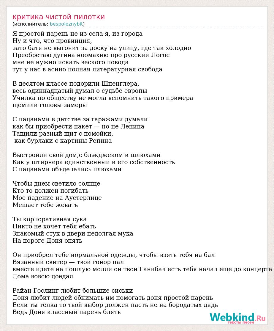 Я простой парень не из села я, из города Ну и что, что провинция, зато батя не выгонит за доску на улицу, где так холодно Преобретаю дугина ноомахию про русский Логос мне не нужно искать веского повода тут у нас в асино полная литературная свобода В десятом классе подорили Шпенглера, весь одиннадцатый думал о судьбе европы Училка по обществу не могла вспомнить такого примера щемили головы замеры С пацанами в детстве за гаражами думали как бы приобрести пакет — но не Ленина Тащили разный щит с помойки, как бурлаки с картины Репина Выстроили свой дом,с блэкджеком и шлюхами Как у штирнера единственный и его собственность С пацанами объделались плюхами Чтобы днем светило солнце Кто то должен погибать Мое падение на Аустерлице Мешает тебе жевать Ты корпоративная сука Никто не хочет тебя ебать Знакомый стук в двери недолгая мука На пороге Доня опять Он приобрел тебе нормальной одежды, чтобы взять тебя на бал Вязанный свитер — твой гонор пал вместе идете на пошлую молли он твой Ганибал есть тебя начал еще до концерта Дома вовсю доедал Райан Гослинг любит большие сиськи Доня любит людей обнимать им помогать доня простой парень Если ты телка то твой выбор должен пасть не на бородатых дядь Ведь Доня классный парень блять