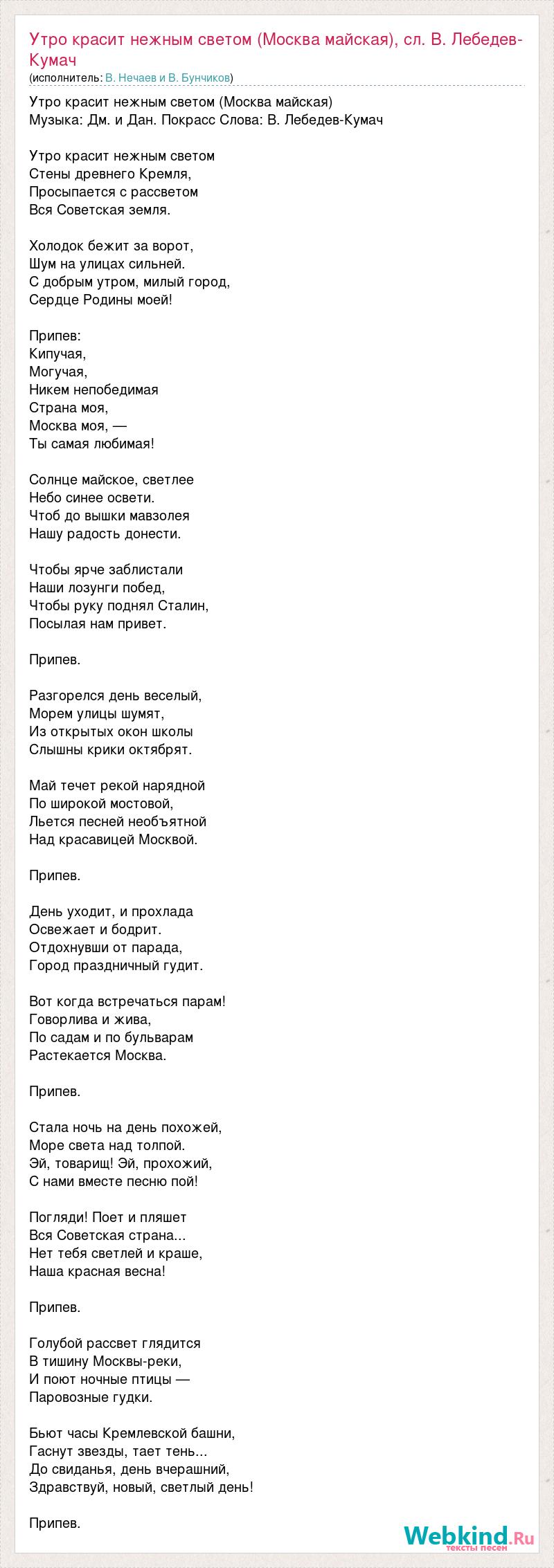 Утро красит нежным светом (Москва майская) Музыка: Дм. и Дан. Покрасс Слова: В. Лебедев-Кумач Утро красит нежным светом Стены древнего Кремля, Просыпается с рассветом Вся Советская земля. Холодок бежит за ворот, Шум на улицах сильней. С добрым утром, милый город, Сердце Родины моей! Припев: Кипучая, Могучая, Никем непобедимая Страна моя, Москва моя, — Ты самая любимая! Солнце майское, светлее Небо синее освети. Чтоб до вышки мавзолея Нашу радость донести. Чтобы ярче заблистали Наши лозунги побед, Чтобы руку поднял Сталин, Посылая нам привет. Припев. Разгорелся день веселый, Морем улицы шумят, Из открытых окон школы Слышны крики октябрят. Май течет рекой нарядной По широкой мостовой, Льется песней необъятной Над красавицей Москвой. Припев. День уходит, и прохлада Освежает и бодрит. Отдохнувши от парада, Город праздничный гудит. Вот когда встречаться парам! Говорлива и жива, По садам и по бульварам Растекается Москва. Припев. Стала ночь на день похожей, Море света над толпой. Эй, товарищ! Эй, прохожий, С нами вместе песню пой! Погляди! Поет и пляшет Вся Советская страна... Нет тебя светлей и краше, Наша красная весна! Припев. Голубой рассвет глядится В тишину Москвы-реки, И поют ночные птицы — Паровозные гудки. Бьют часы Кремлевской башни, Гаснут звезды, тает тень... До свиданья, день вчерашний, Здравствуй, новый, светлый день! Припев.