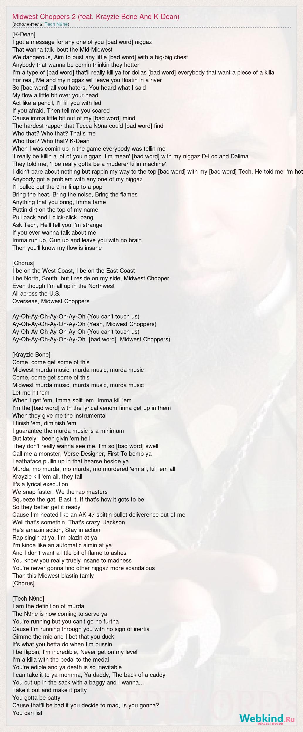 [K-Dean] I got a message for any one of you [bad word] niggaz That wanna talk 'bout the Mid-Midwest We dangerous, Aim to bust any little [bad word] with a big-big chest Anybody that wanna be comin thinkin they hotter I'm a type of [bad word] that'll really kill ya for dollas [bad word] everybody that want a piece of a killa For real, Me and my niggaz will leave you floatin in a river So [bad word] all you haters, You heard what I said My flow a little bit over your head Act like a pencil, I'll fill you with led If you afraid, Then tell me you scared Cause imma little bit out of my [bad word] mind The hardest rapper that Tecca N9na could [bad word] find Who that? Who that? That's me Who that? Who that? K-Dean When I was comin up in the game everybody was tellin me 'I really be killin a lot of you niggaz, I'm mean' [bad word] with my niggaz D-Loc and Dalima They told me, 'I be really gotta be a muderer killin machine' I didn't care about nothing but rappin my way to the top [bad word] with my [bad word] Tech, He told me I'm hot Anybody got a problem with any one of my niggaz I'll pulled out the 9 milli up to a pop Bring the heat, Bring the noise, Bring the flames Anything that you bring, Imma tame Puttin dirt on the top of my name Pull back and I click-click, bang Ask Tech, He'll tell you I'm strange If you ever wanna talk about me Imma run up, Gun up and leave you with no brain Then you'll know my flow is insane [Chorus] I be on the West Coast, I be on the East Coast I be North, South, but I reside on my side, Midwest Chopper Even though I'm all up in the Northwest All across the U.S. Overseas, Midwest Choppers Ay-Oh-Ay-Oh-Ay-Oh-Ay-Oh (You can't touch us) Ay-Oh-Ay-Oh-Ay-Oh-Ay-Oh (Yeah, Midwest Choppers) Ay-Oh-Ay-Oh-Ay-Oh-Ay-Oh (You can't touch us) Ay-Oh-Ay-Oh-Ay-Oh-Ay-Oh [bad word] Midwest Choppers) [Krayzie Bone] Come, come get some of this Midwest murda music, murda music, murda music Come, come get some of this Midwest murda music, murda music, murda music Let me hit 'em When I get 'em, Imma split 'em, Imma kill 'em I'm the [bad word] with the lyrical venom finna get up in them When they give me the instrumental I finish 'em, diminish 'em I guarantee the murda music is a minimum But lately I been givin 'em hell They don't really wanna see me, I'm so [bad word] swell Call me a monster, Verse Designer, First To bomb ya Leathaface pullin up in that hearse beside ya Murda, mo murda, mo murda, mo murdered 'em all, kill 'em all Krayzie kill 'em all, they fall It's a lyrical execution We snap faster, We the rap masters Squeeze the gat, Blast it, If that's how it gots to be So they better get it ready Cause I'm heated like an AK-47 spittin bullet deliverence out of me Well that's somethin, That's crazy, Jackson He's amazin action, Stay in action Rap singin at ya, I'm blazin at ya I'm kinda like an automatic aimin at ya And I don't want a little bit of flame to ashes You know you really truely insane to madness You're never gonna find other niggaz more scandalous Than this Midwest blastin famly [Chorus] [Tech N9ne] I am the definition of murda The N9ne is now coming to serve ya You're running but you can't go no furtha Cause I'm running through you with no sign of inertia Gimme the mic and I bet that you duck It's what you betta do when I'm bussin I be flippin, I'm incredible, Never get on my level I'm a killa with the pedal to the medal You're edible and ya death is so inevitable I can take it to ya momma, Ya daddy, The back of a caddy You cut up in the sack with a baggy and I wanna... Take it out and make it patty You gotta be patty Cause that'll be bad if you decide to mad, Is you gonna? You can list