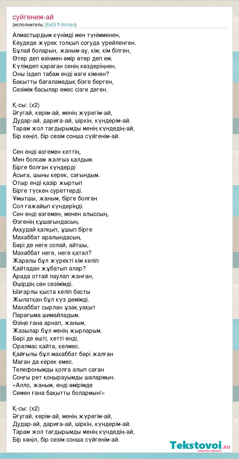 Алмастырдым күнімді мен түнімменен, Кеудеде жүрек толқып соғуда үрейленген. Бұлай боларын, жаным-ау, кім, кім білген, Өтер деп өзіңмен өмір өтер деп ем. Күлімдеп қараған сенің көздеріңнен, Оны іздеп табам енді өзге кімнен? Бақытты бағаламадық бізге берген, Сезімім басылар емес сізге деген. Қ-сы: (х2) Әгугай, керім-ай, менің жүрегім-ай, Дудар-ай, дариға-ай, шіркін, күндерім-ай. Тарам жол тағдырымды менің күндедің-ай, Бір көңіл, бір сезім сонша сүйгенім-ай. Сен енді өзгемен кеттің, Мен болсам жалғыз қалдым. Бірге болған күндерді Асыға, шыны керек, сағындым. Отыр енді қазір жыртып Бірге түскен суреттерді. Ұмытшы, жаным, бірге болған Сол ғажайып күндеріңді. Сен енді өзгемен, менен алыссың, Өзгенің құшағындасың. Аққудай қалқып, ұшып бірге Махаббат аралындасың. Бәрі де неге солай, айтшы, Махаббат неге, неге қатал? Жаралы бұл жүректі кім келіп Қайтадан жұбатып алар? Арада оттай лаулап жанған, Өшірдің сен сезімімді. Ызғарлы қыста келіп басты Жылатқан бұл күз демімді. Махаббат сырлан ұзақ уақыт Парағыма шимайладым. Өзіңе ғана арнап, жаным, Жазылар бұл менің жырларым. Бәрі де өшті, кетті енді, Оралмас қайта, келмес. Қайғылы бұл махаббат бәрі жалған Маған да керек емес. Телефонымды қолға алып саған Соңғы рет қоңырауымды шалармын. «Алло, жаным, енді өмірімде Семен ғана бақытты болармын!» Қ-сы: (х2) Әгугай, керім-ай, менің жүрегім-ай, Дудар-ай, дариға-ай, шіркін, күндерім-ай. Тарам жол тағдырымды менің күндедің-ай, Бір көңіл, бір сезім сонша сүйгенім-ай.