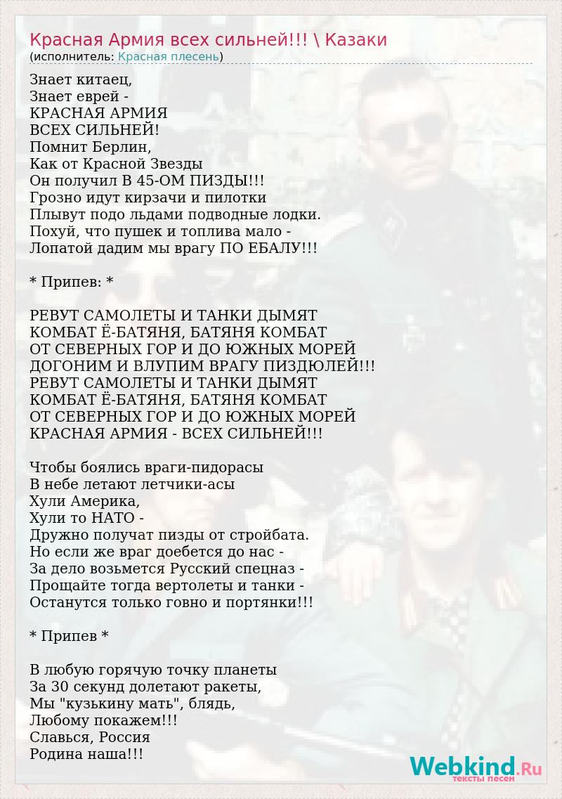 Знает китаец, Знает еврей - КРАСНАЯ АРМИЯ ВСЕХ СИЛЬНЕЙ! Помнит Берлин, Как от Красной Звезды Он получил В 45-ОМ ПИЗДЫ!!! Грозно идут кирзачи и пилотки Плывут подо льдами подводные лодки. Похуй, что пушек и топлива мало - Лопатой дадим мы врагу ПО ЕБАЛУ!!! * Припев: * РЕВУТ САМОЛЕТЫ И ТАНКИ ДЫМЯТ КОМБАТ Ё-БАТЯНЯ, БАТЯНЯ КОМБАТ ОТ СЕВЕРНЫХ ГОР И ДО ЮЖНЫХ МОРЕЙ ДОГОНИМ И ВЛУПИМ ВРАГУ ПИЗДЮЛЕЙ!!! РЕВУТ САМОЛЕТЫ И ТАНКИ ДЫМЯТ КОМБАТ Ё-БАТЯНЯ, БАТЯНЯ КОМБАТ ОТ СЕВЕРНЫХ ГОР И ДО ЮЖНЫХ МОРЕЙ КРАСНАЯ АРМИЯ - ВСЕХ СИЛЬНЕЙ!!! Чтобы боялись враги-пидорасы В небе летают летчики-асы Хули Америка, Хули то НАТО - Дружно получат пизды от стройбата. Но если же враг доебется до нас - За дело возьмется Русский спецназ - Прощайте тогда вертолеты и танки - Останутся только говно и портянки!!! * Припев * В любую горячую точку планеты За 30 секунд долетают ракеты, Мы "кузькину мать", блядь, Любому покажем!!! Славься, Россия Родина наша!!!