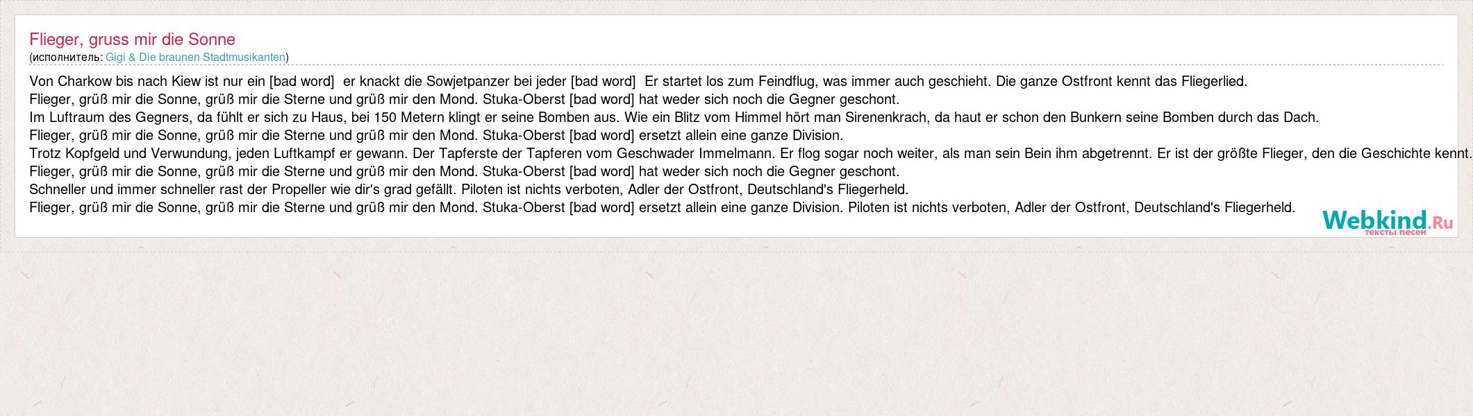 Von Charkow bis nach Kiew ist nur ein [bad word] er knackt die Sowjetpanzer bei jeder [bad word] Er startet los zum Feindflug, was immer auch geschieht. Die ganze Ostfront kennt das Fliegerlied. Flieger, grüß mir die Sonne, grüß mir die Sterne und grüß mir den Mond. Stuka-Oberst [bad word] hat weder sich noch die Gegner geschont. Im Luftraum des Gegners, da fühlt er sich zu Haus, bei 150 Metern klingt er seine Bomben aus. Wie ein Blitz vom Himmel hört man Sirenenkrach, da haut er schon den Bunkern seine Bomben durch das Dach. Flieger, grüß mir die Sonne, grüß mir die Sterne und grüß mir den Mond. Stuka-Oberst [bad word] ersetzt allein eine ganze Division. Trotz Kopfgeld und Verwundung, jeden Luftkampf er gewann. Der Tapferste der Tapferen vom Geschwader Immelmann. Er flog sogar noch weiter, als man sein Bein ihm abgetrennt. Er ist der größte Flieger, den die Geschichte kennt. Flieger, grüß mir die Sonne, grüß mir die Sterne und grüß mir den Mond. Stuka-Oberst [bad word] hat weder sich noch die Gegner geschont. Schneller und immer schneller rast der Propeller wie dir's grad gefällt. Piloten ist nichts verboten, Adler der Ostfront, Deutschland's Fliegerheld. Flieger, grüß mir die Sonne, grüß mir die Sterne und grüß mir den Mond. Stuka-Oberst [bad word] ersetzt allein eine ganze Division. Piloten ist nichts verboten, Adler der Ostfront, Deutschland's Fliegerheld.