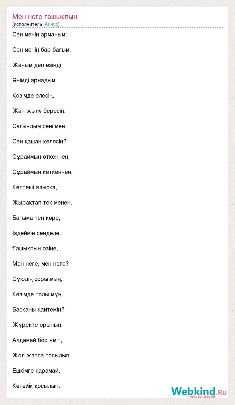 Сен менің арманым, Сен менің бар бағым. Жаным деп өзіңді, Әнімді арнадым. Көзімде елесің, Жан жылу бересің. Сағындым сені мен, Сен қашан келесің? Сұраймын өткеннен, Сұраймын кеткеннен. Кетпеші алысқа, Жырақтап тек менен. Бағыма тең көре, Іздеймін сенделе. Ғашықпын өзіңе, Мен неге, мен неге? Сүюдің соры мың, Көзімде толы мұң. Басқаны қайтемін? Жүректе орының. Алдамай бос үміт, Жол жатса тосылып. Ешкімге қарамай, Кетейік қосылып.
