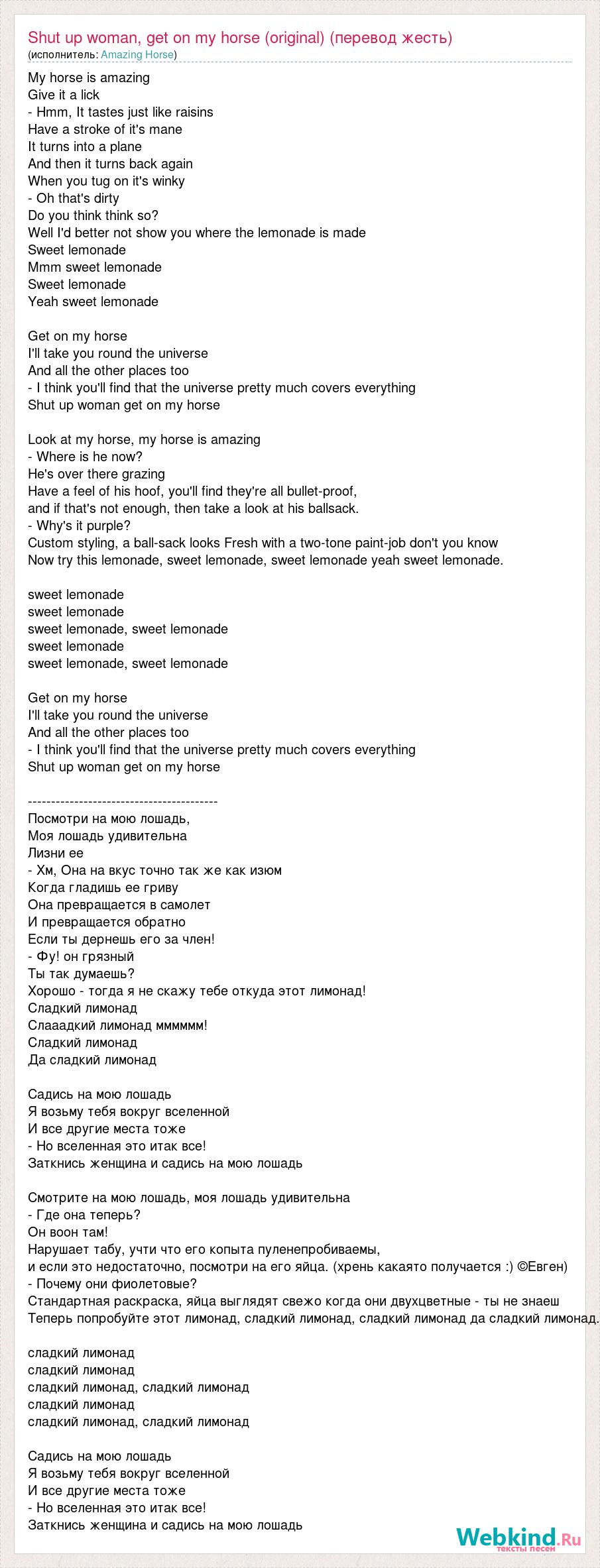 My horse is amazing Give it a lick - Hmm, It tastes just like raisins Have a stroke of it's mane It turns into a plane And then it turns back again When you tug on it's winky - Oh that's dirty Do you think think so? Well I'd better not show you where the lemonade is made Sweet lemonade Mmm sweet lemonade Sweet lemonade Yeah sweet lemonade Get on my horse I'll take you round the universe And all the other places too - I think you'll find that the universe pretty much covers everything Shut up woman get on my horse Look at my horse, my horse is amazing - Where is he now? He's over there grazing Have a feel of his hoof, you'll find they're all bullet-proof, and if that's not enough, then take a look at his ballsack. - Why's it purple? Custom styling, a ball-sack looks Fresh with a two-tone paint-job don't you know Now try this lemonade, sweet lemonade, sweet lemonade yeah sweet lemonade. sweet lemonade sweet lemonade sweet lemonade, sweet lemonade sweet lemonade sweet lemonade, sweet lemonade Get on my horse I'll take you round the universe And all the other places too - I think you'll find that the universe pretty much covers everything Shut up woman get on my horse ----------------------------------------- Посмотри на мою лошадь, Моя лошадь удивительна Лизни ее - Хм, Она на вкус точно так же как изюм Когда гладишь ее гриву Она превращается в самолет И превращается обратно Если ты дернешь его за член! - Фу! он грязный Ты так думаешь? Хорошо - тогда я не скажу тебе откуда этот лимонад! Сладкий лимонад Слааадкий лимонад мммммм! Сладкий лимонад Да сладкий лимонад Садись на мою лошадь Я возьму тебя вокруг вселенной И все другие места тоже - Но вселенная это итак все! Заткнись женщина и садись на мою лошадь Cмотрите на мою лошадь, моя лошадь удивительна - Где она теперь? Он воон там! Нарушает табу, учти что его копыта пуленепробиваемы, и если это недостаточно, посмотри на его яйца. (хрень какаято получается :) ©Евген) - Почему они фиолетовые? Стандартная раскраска, яйца выглядят свежо когда они двухцветные - ты не знаеш Теперь попробуйте этот лимонад, сладкий лимонад, сладкий лимонад да сладкий лимонад. сладкий лимонад сладкий лимонад сладкий лимонад, сладкий лимонад сладкий лимонад сладкий лимонад, сладкий лимонад Садись на мою лошадь Я возьму тебя вокруг вселенной И все другие места тоже - Но вселенная это итак все! Заткнись женщина и садись на мою лошадь