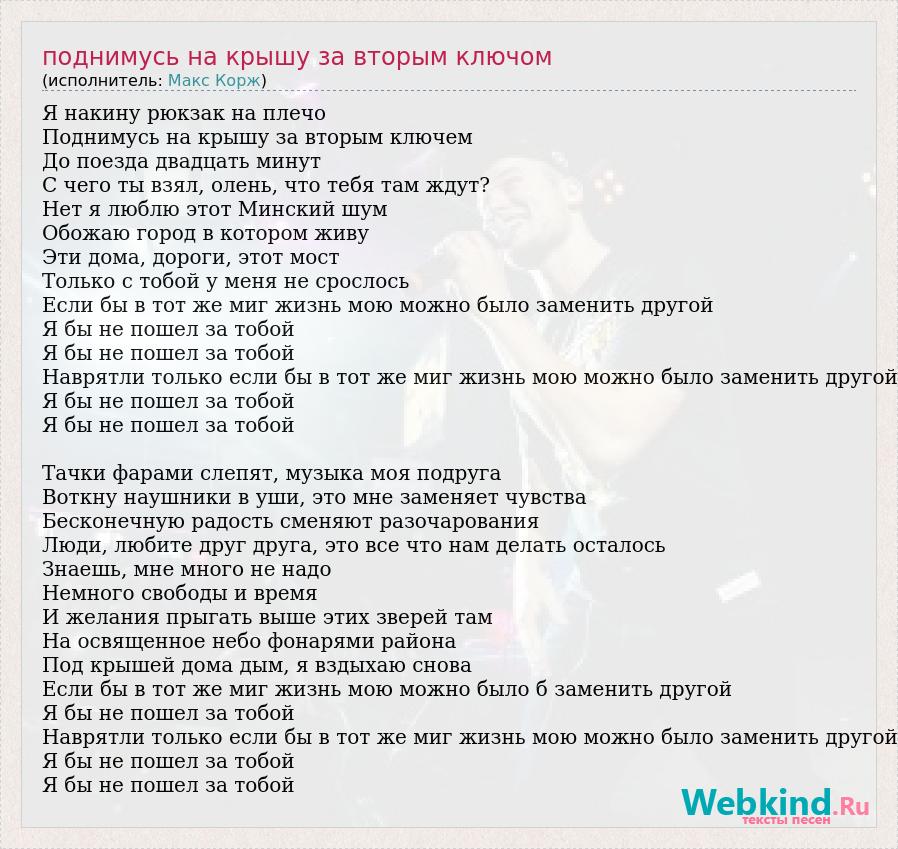 Я накину рюкзак на плечо Поднимусь на крышу за вторым ключем До поезда двадцать минут С чего ты взял, олень, что тебя там ждут? Нет я люблю этот Минский шум Обожаю город в котором живу Эти дома, дороги, этот мост Только с тобой у меня не срослось Если бы в тот же миг жизнь мою можно было заменить другой Я бы не пошел за тобой Я бы не пошел за тобой Наврятли только если бы в тот же миг жизнь мою можно было заменить другой Я бы не пошел за тобой Я бы не пошел за тобой Тачки фарами слепят, музыка моя подруга Воткну наушники в уши, это мне заменяет чувства Бесконечную радость сменяют разочарования Люди, любите друг друга, это все что нам делать осталось Знаешь, мне много не надо Немного свободы и время И желания прыгать выше этих зверей там На освященное небо фонарями района Под крышей дома дым, я вздыхаю снова Если бы в тот же миг жизнь мою можно было б заменить другой Я бы не пошел за тобой Наврятли только если бы в тот же миг жизнь мою можно было заменить другой Я бы не пошел за тобой Я бы не пошел за тобой