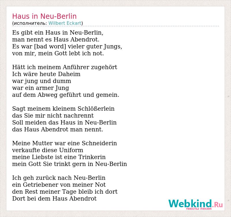 Es gibt ein Haus in Neu-Berlin, man nennt es Haus Abendrot. Es war [bad word] vieler guter Jungs, von mir, mein Gott lebt ich not. Hätt ich meinem Anführer zugehört Ich wäre heute Daheim war jung und dumm war ein armer Jung auf dem Abweg geführt und gemein. Sagt meinem kleinem Schlößerlein das Sie mir nicht nachrennt Soll meiden das Haus in Neu-Berlin das Haus Abendrot man nennt. Meine Mutter war eine Schneiderin verkaufte diese Uniform meine Liebste ist eine Trinkerin mein Gott Sie trinkt gern in Neu-Berlin Ich geh zurück nach Neu-Berlin ein Getriebener von meiner Not den Rest meiner Tage bleib ich dort Dort bei dem Haus Abendrot