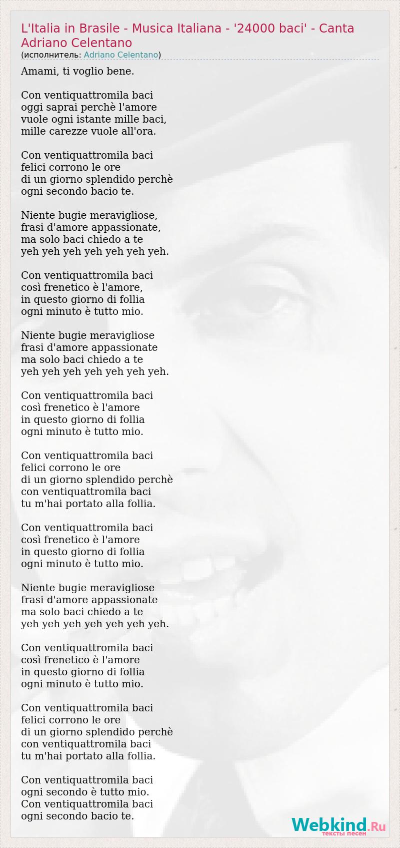 Amami, ti voglio bene. Con ventiquattromila baci oggi saprai perchè l'amore vuole ogni istante mille baci, mille carezze vuole all'ora. Con ventiquattromila baci felici corrono le ore di un giorno splendido perchè ogni secondo bacio te. Niente bugie meravigliose, frasi d'amore appassionate, ma solo baci chiedo a te yeh yeh yeh yeh yeh yeh yeh. Con ventiquattromila baci così frenetico è l'amore, in questo giorno di follia ogni minuto è tutto mio. Niente bugie meravigliose frasi d'amore appassionate ma solo baci chiedo a te yeh yeh yeh yeh yeh yeh yeh. Con ventiquattromila baci così frenetico è l'amore in questo giorno di follia ogni minuto è tutto mio. Con ventiquattromila baci felici corrono le ore di un giorno splendido perchè con ventiquattromila baci tu m'hai portato alla follia. Con ventiquattromila baci così frenetico è l'amore in questo giorno di follia ogni minuto è tutto mio. Niente bugie meravigliose frasi d'amore appassionate ma solo baci chiedo a te yeh yeh yeh yeh yeh yeh yeh. Con ventiquattromila baci così frenetico è l'amore in questo giorno di follia ogni minuto è tutto mio. Con ventiquattromila baci felici corrono le ore di un giorno splendido perchè con ventiquattromila baci tu m'hai portato alla follia. Con ventiquattromila baci ogni secondo è tutto mio. Con ventiquattromila baci ogni secondo bacio te.